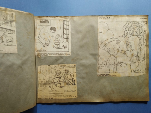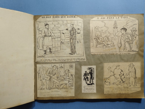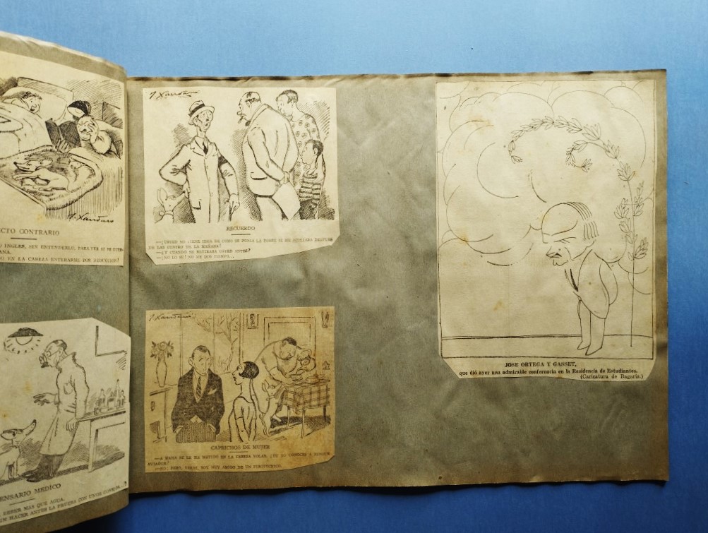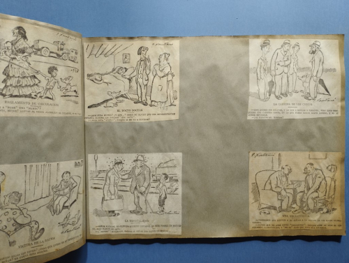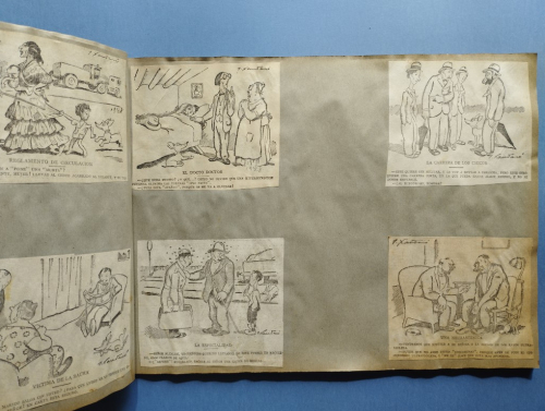 En cada hoja por lo general 8 chistes - en total unos 250 chistes - recortados probablemente del ABC o Blanco y Negro de los años 20 (varios están fechados a mano en 1928.) La mayor parte son de Xaudaró (un 90%), y el resto de otros humoristas.