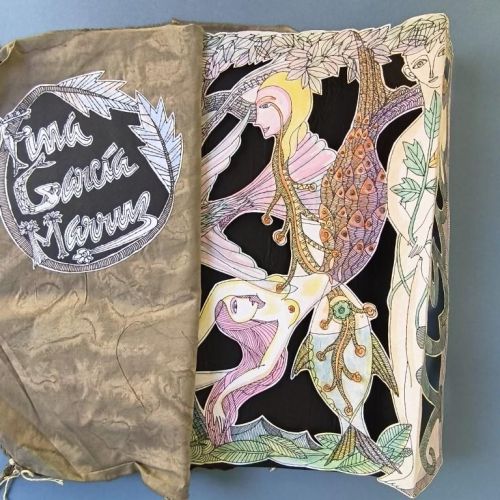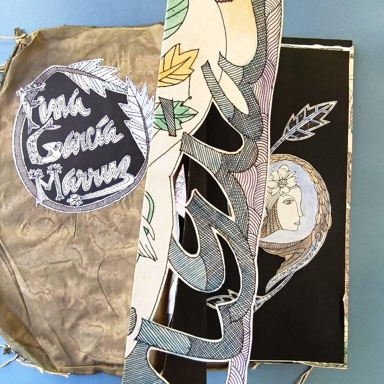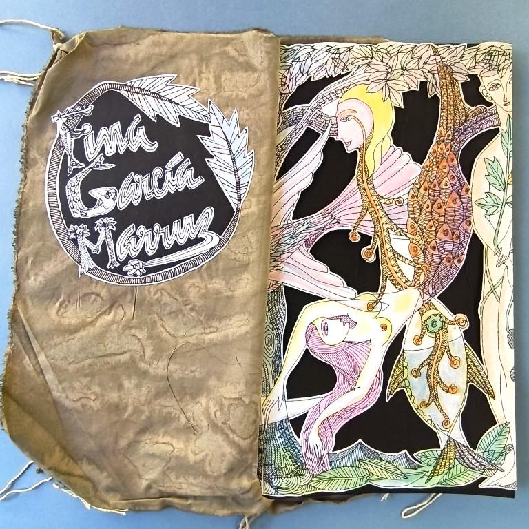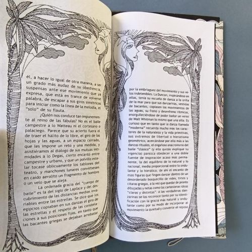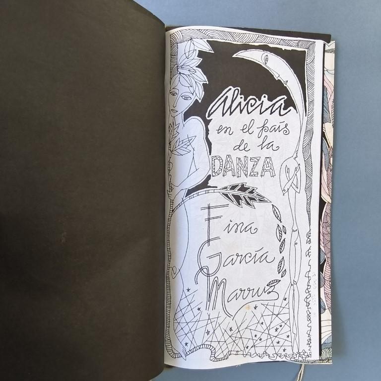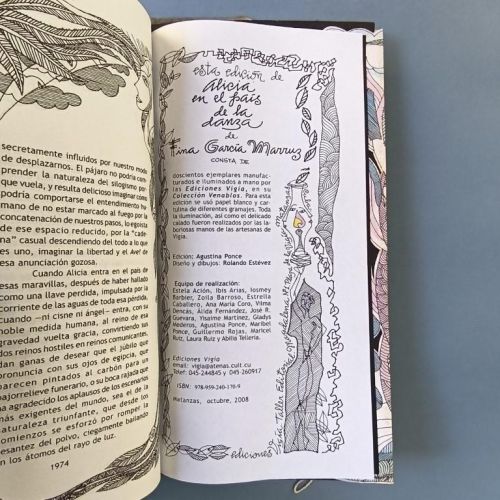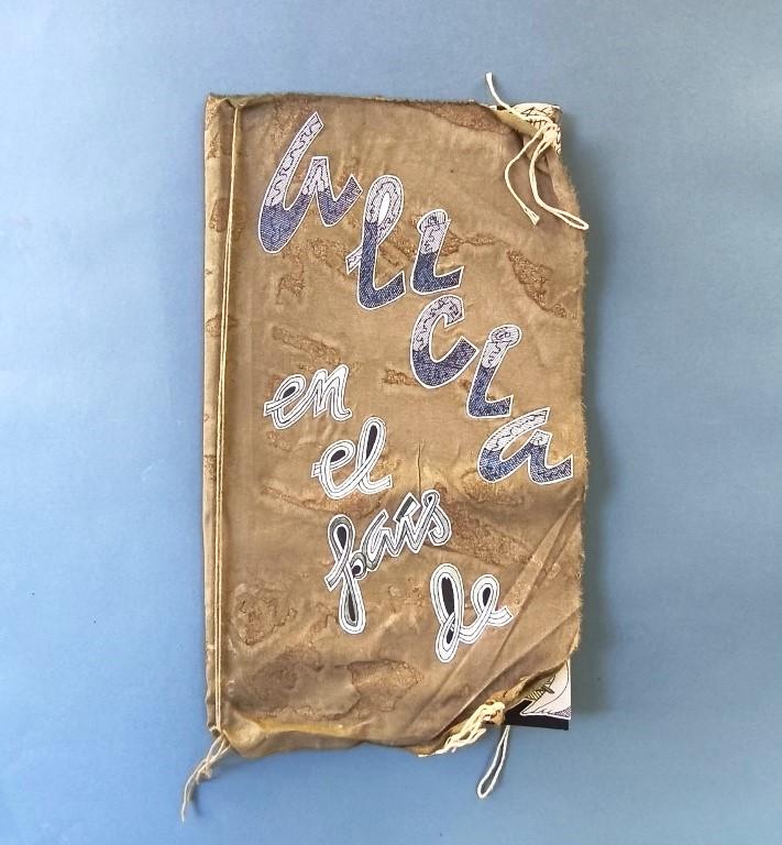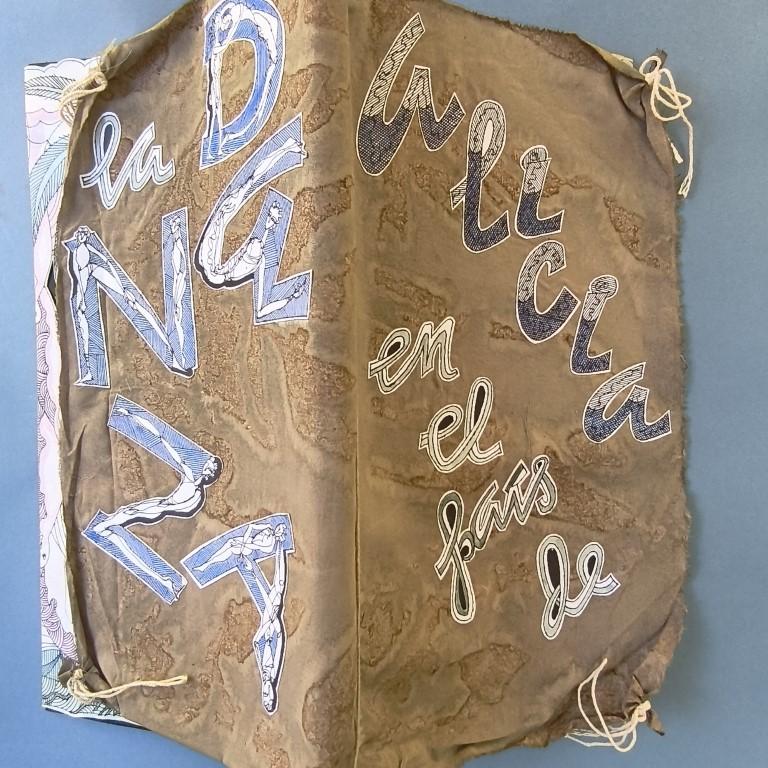 Stapled wrappers, with a double dust jacket: the first is cut-out, featuring surrealist drawings that bridge the worlds of Alice and dance. The second is made of old fabric, irregularly dyed, with the letters of the title cut out of paper, coloured and mounted. Risograph print on white paper. Number 159 of a print run of 200. In my opinion, this is one of Vigía’s most beautiful and best-designed books. More photos on our website.