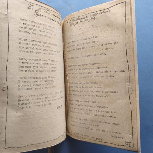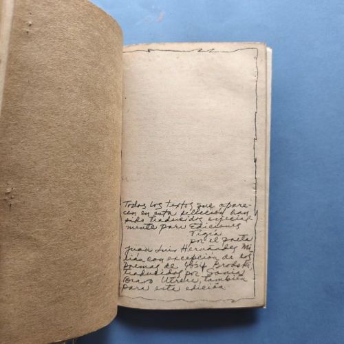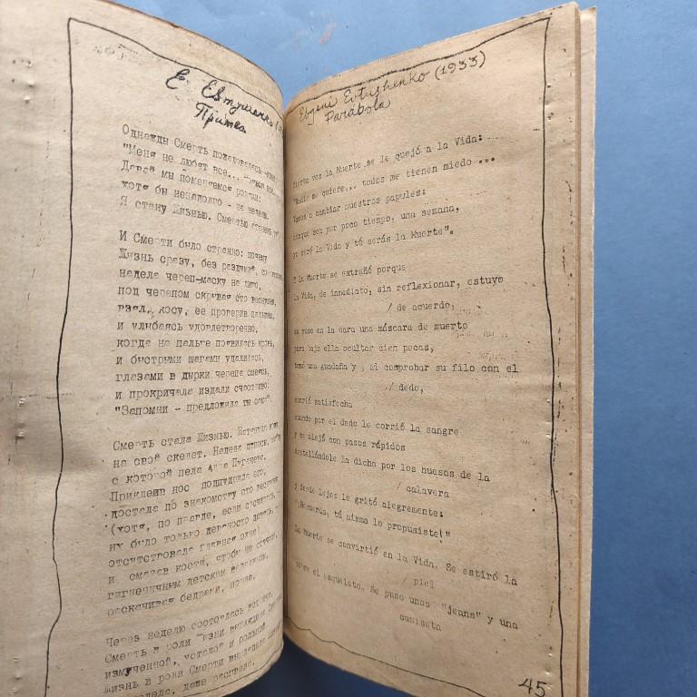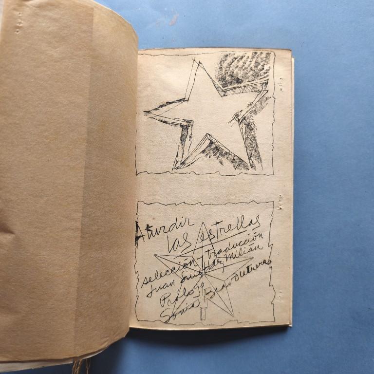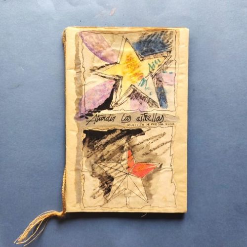 Typed and handwritten text in Spanish and Russian mimeographed on crude white paper, with illustrations on unbleached wrapping paper. The dustwrapper has been watercoloured, with various collage elements. Stapled, and tied with jute string. Poems by A.S. Pushkin, M.Y. Lermontov, Alexander Block, V.V. Mayakovski, B. L. Pasternak, Marina I. Isvetaeva, Serguei A. Esenin, Ana A. Ajmatova, Ebgeni Evtushenko, Vladimir Visotski, Yosif Brodski, translated by Cuban poet Juan Luis Hernádez. Milián, with a prologue by Sonia Bravo Utrera. Number 57 of 200 copies. Water stain in the inner margin of the last 3 leaves, staple marks in the outer margin (this suggests it was incorrectly stapled by the Vigía team) otherwise very good. More photos on our website.