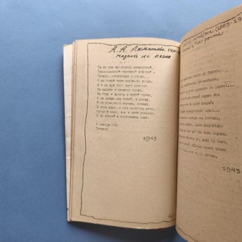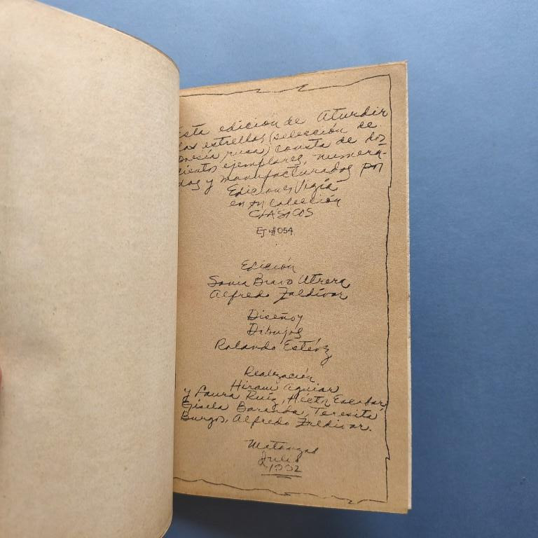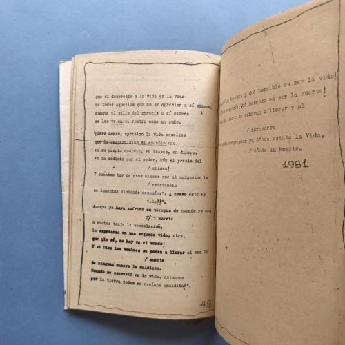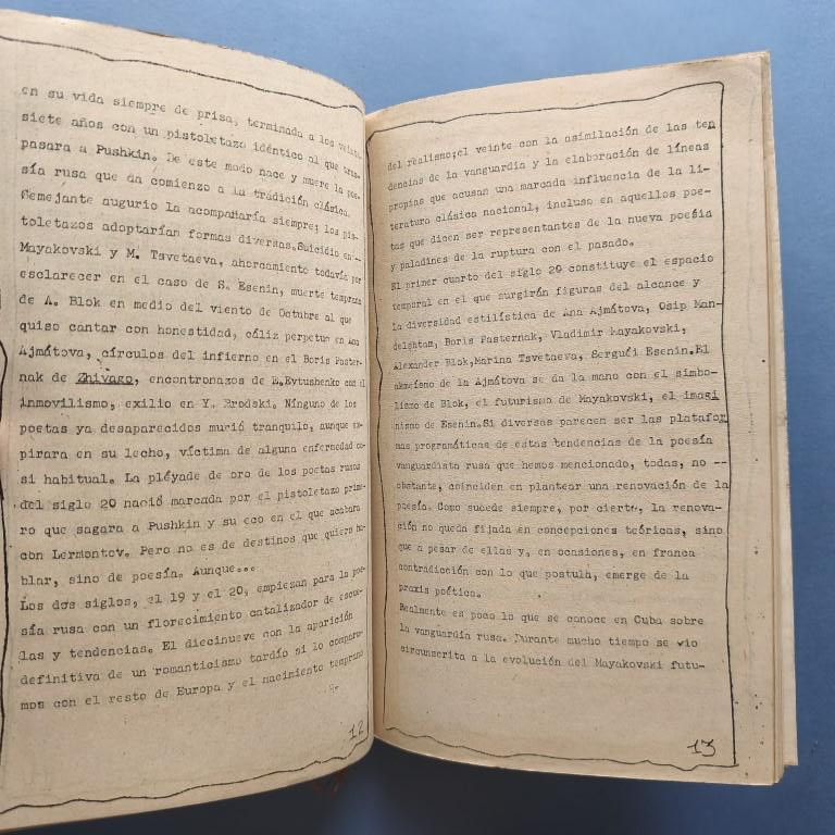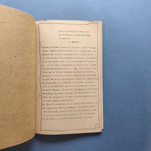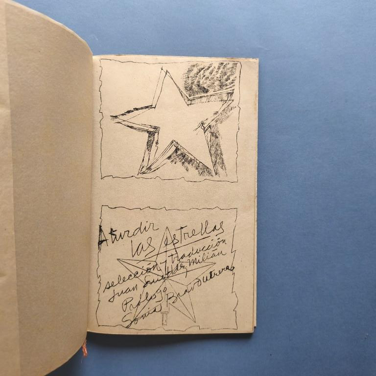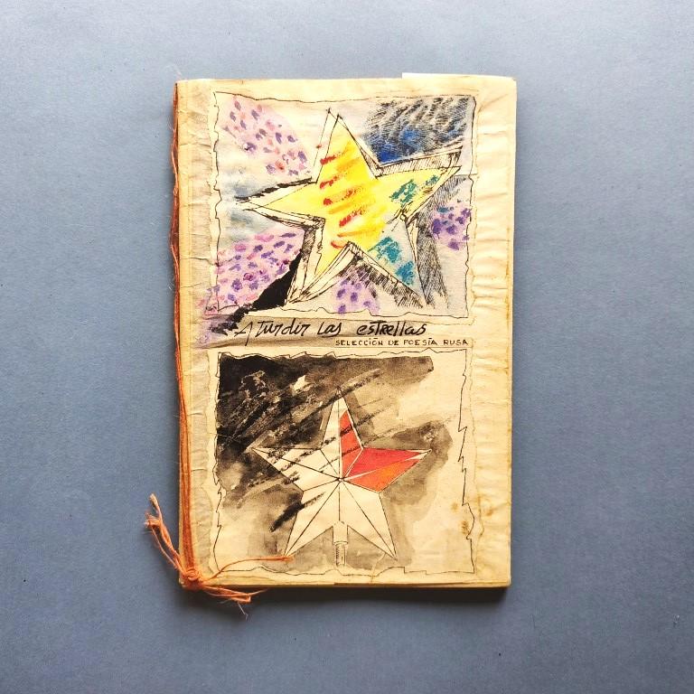 Stapled cardboard, dust jacket secured with string. Typed and handwritten text in Spanish and Russian mimeographed on crude white paper, with illustrations on unbleached wrapping paper. The dustwrapper has been watercoloured, with various collage elements. Stapled, and tied with jute string. Poems by A.S. Pushkin, M.Y. Lermontov, Alexander Block, V.V. Mayakovski, B. L. Pasternak, Marina I. Isvetaeva, Serguei A. Esenin, Ana A. Ajmatova, Ebgeni Evtushenko, Vladimir Visotski, Yosif Brodski, translated by Cuban poet Juan Luis Hernádez. Milián, with a prologue by Sonia Bravo Utrera. Number 54 of 200 copies. More photos on our website.