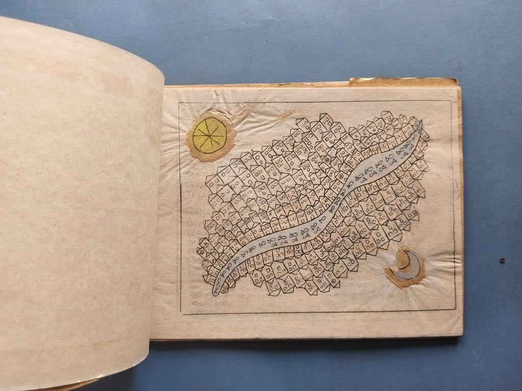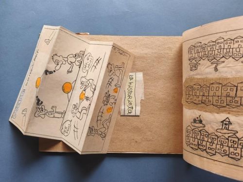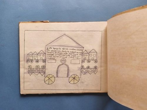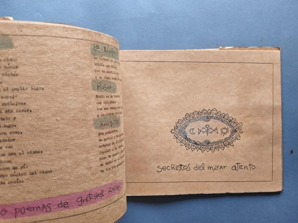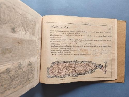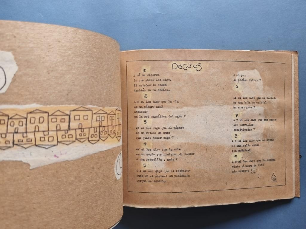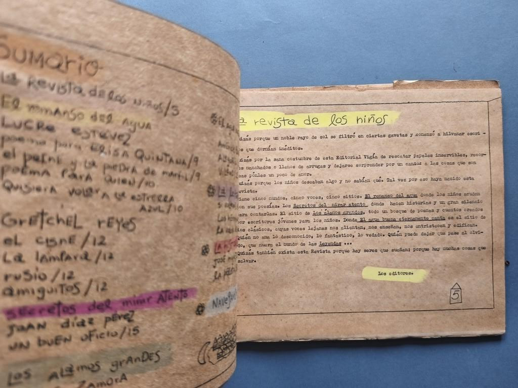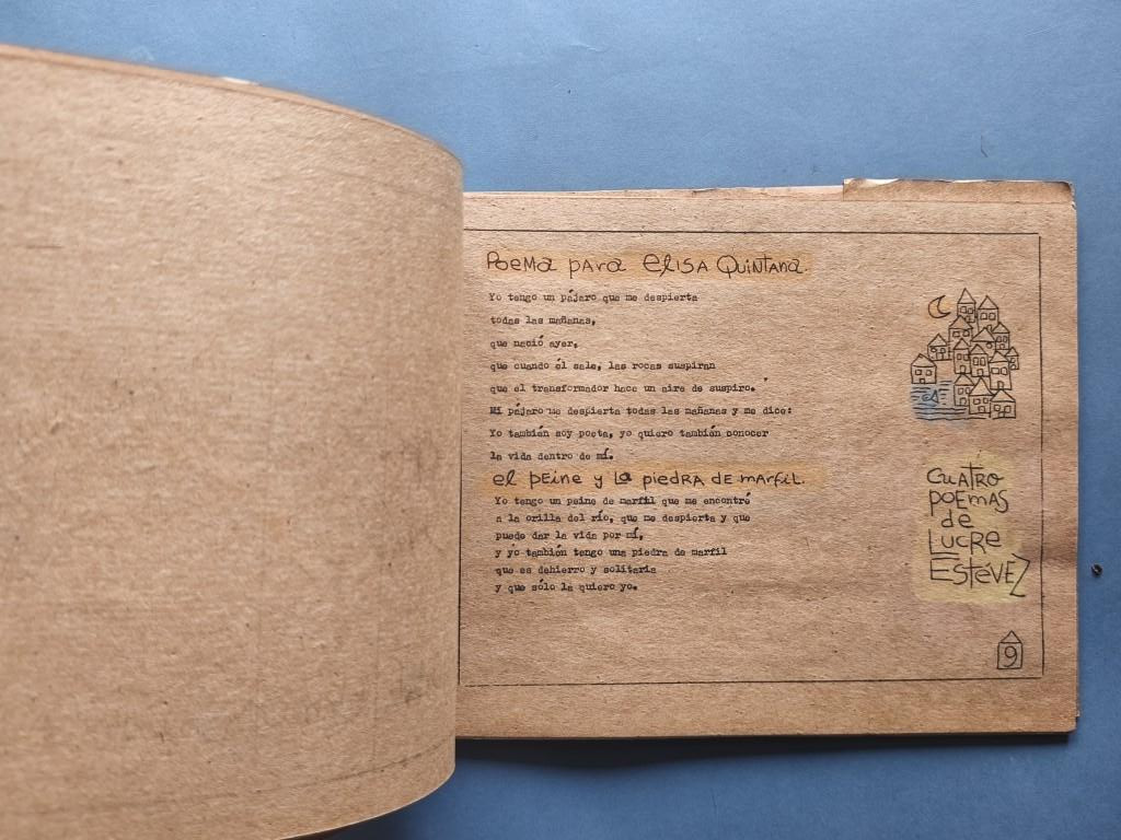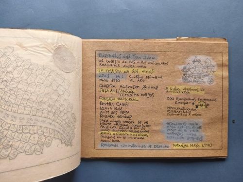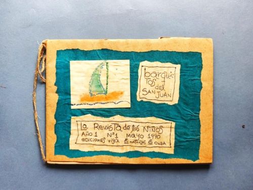 Wrappers, stapled, with a kraft paper dust jacket featuring torn-out-and-mounted titles and a design decorated with fabric cut-outs. The book is bound with a hessian twine. Text and illustrations mimeographed on kraft paper; illustrations and titles hand-illuminated. Includes a ‘comic strip’ folded like an accordion and held together with a strip of paper (in the style of the ‘scrolls’ from Revista de Vigía). Most of the contributors to this first issue are aged 15 or under. The illustrations by Arístides Vega are very apt. Issue 53 of a print run of 200 copies. A very fine copy. Very rare. One copy in the Ibero-American Institute, no other institutional holdings. More photos on our website.