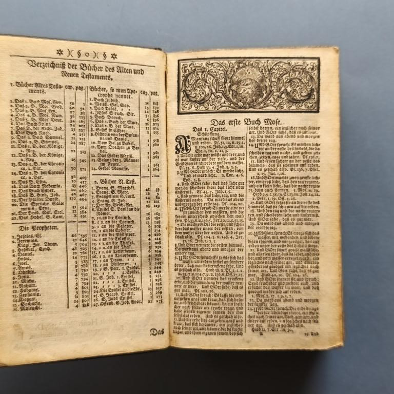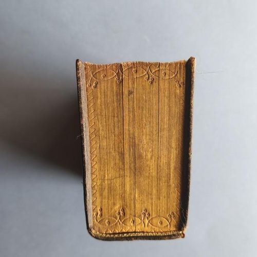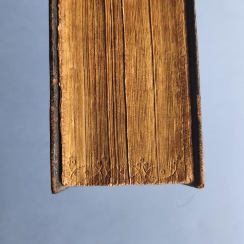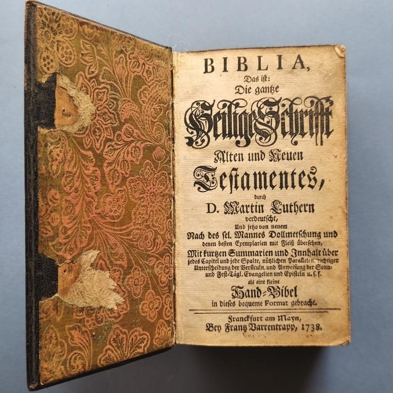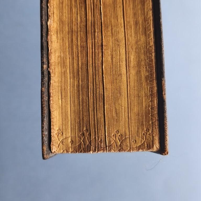Lacking one page (?) of text at the end of the New Testament; the last page in this copy contains the first verses of chapter 18 (of 22 chapters) of Revalations. Also lacking the two free end papers.