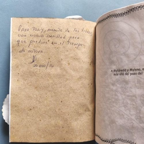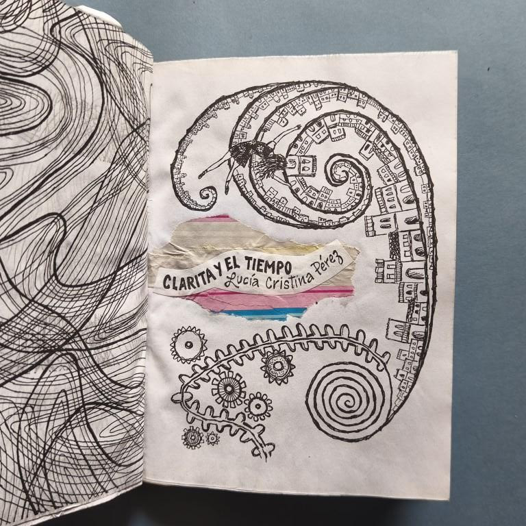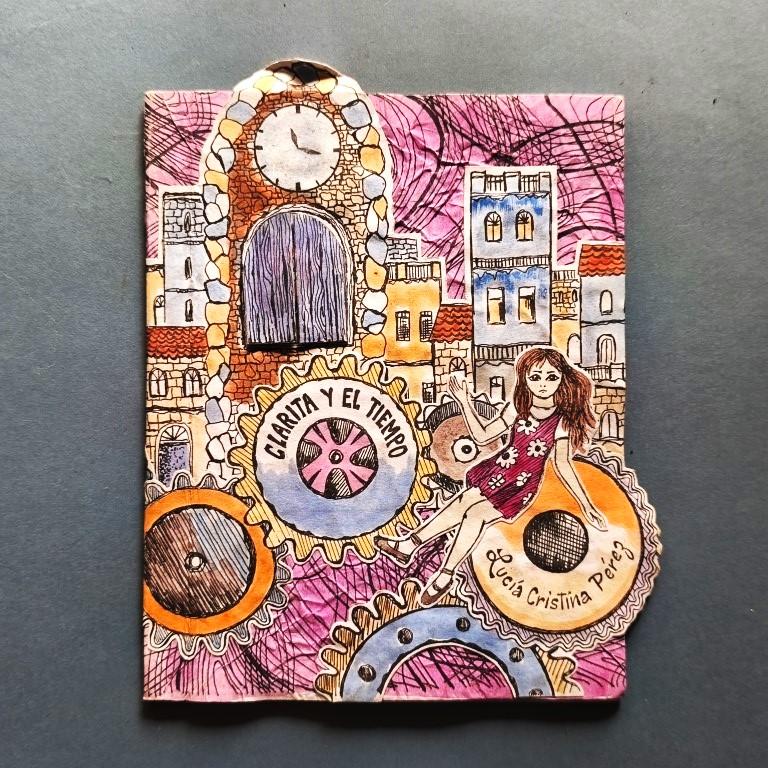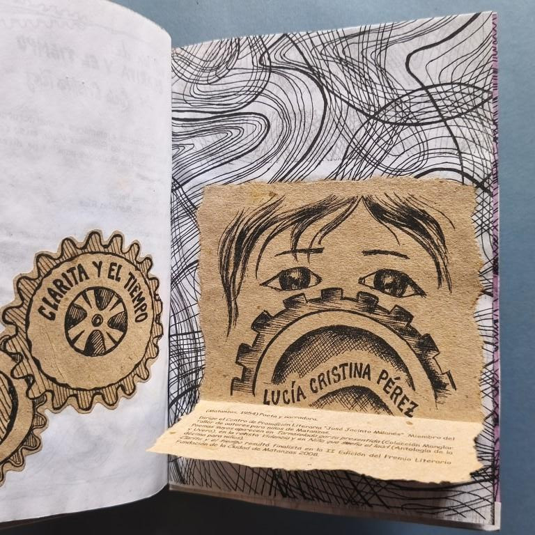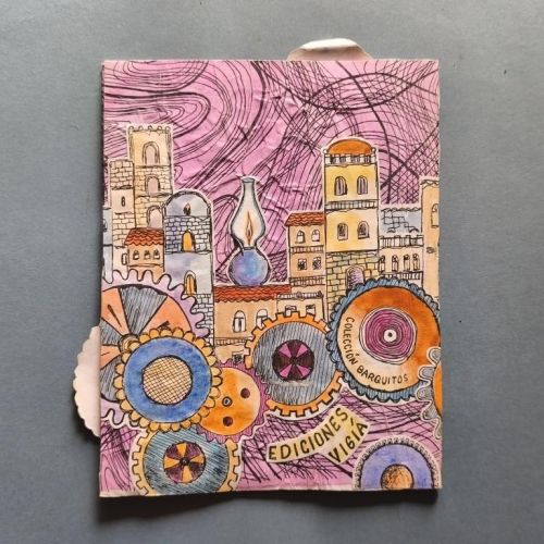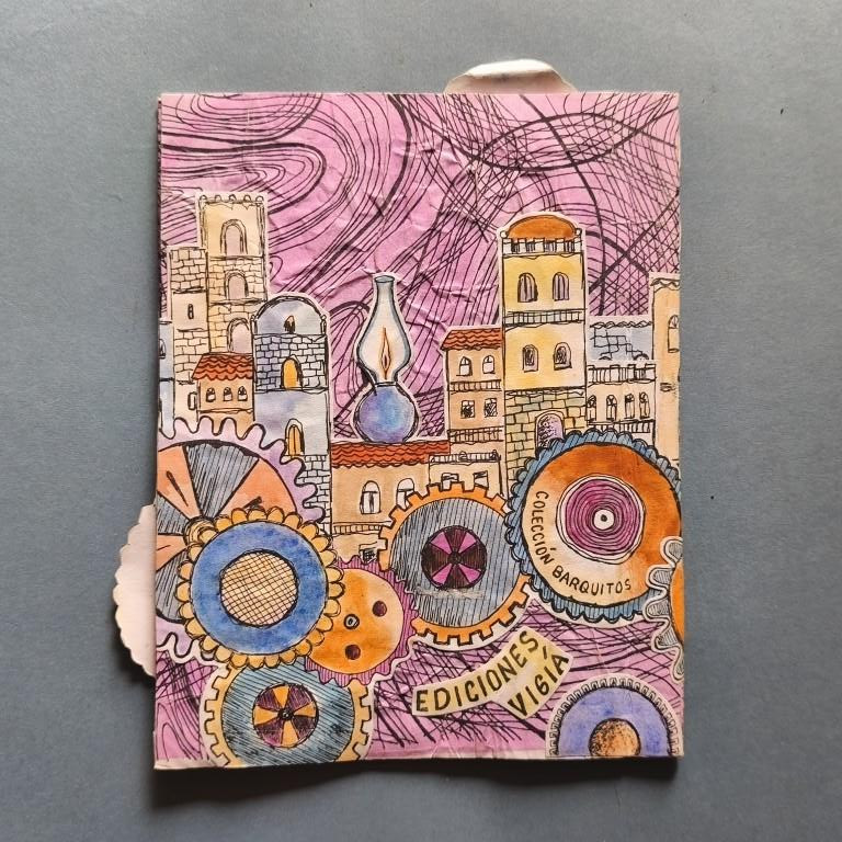 Wrappers, stapled. The cover is covered in crinkled, coloured paper; mounted on this is a design of old houses in a town, featuring a clock whose doors open to reveal a little bird (perhaps a Cuban cuckoo?); mounted on top of these drawings are several cogwheels, and on top of them, a little girl. These illustrations extend beyond the margin of the cover. Risograph text, bordered and illustrated. Autographed dedication. No. 33 of 200 copies.