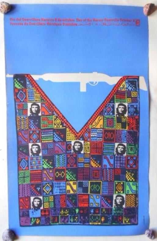 Clásico cartel OSPAAAL publicado en 1970 para los subscritores de la revista Tricontinental. Muestra una camisa cuyo estilo indígeno americano incorpora el imagen de Che Guevara, colgada de un rifle. Sin pliegues (no ha sido doblado). Excepcional ejemplar.