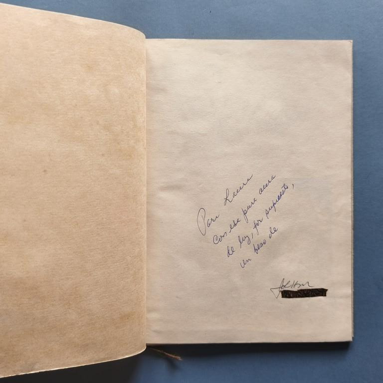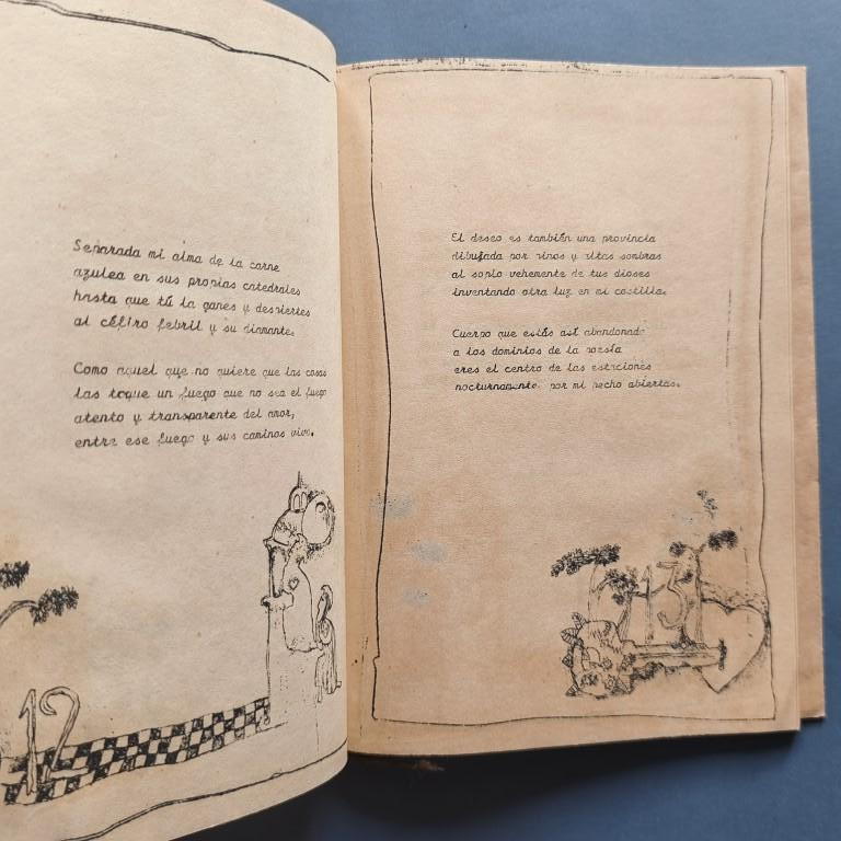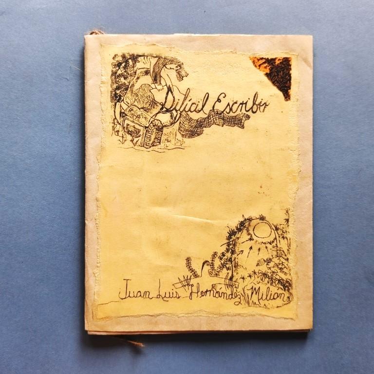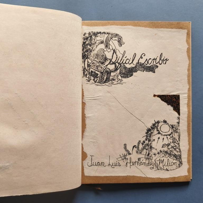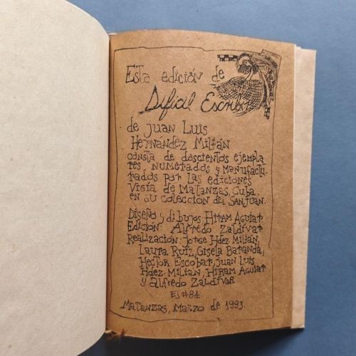 Wrappers, stapled. The cover is tied with jute twine. The text, which is bordered and illustrated, was typeset on an electric typewriter and mimeographed onto brown paper and other low-quality papers, and decorated with cut-outs from old decorative paper. Number 84 of a print run of 200 copies. Autographed dedication. The author is a poet and translator, born in Matanzas in 1938. Only 5 copies in WorldCat.