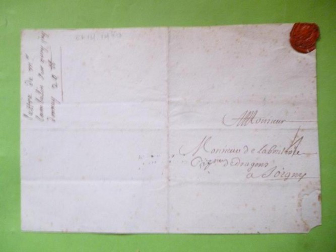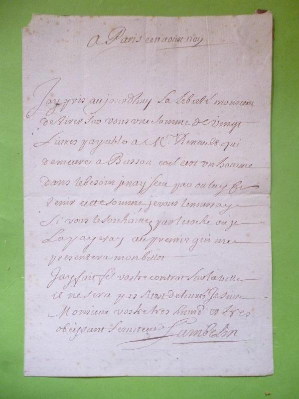 Original letter signed 'Lambelin', dated Pais aoust, 1709, to: 'Monsieur de Labrulerie, Captn de dragons a Soigny'. 'Jay pris aujoudhui la liberté monsieur de tirer sur vous une somme de vingt livres payable a M Renault qui demuere a Basson...'. With rests of red wax seal.