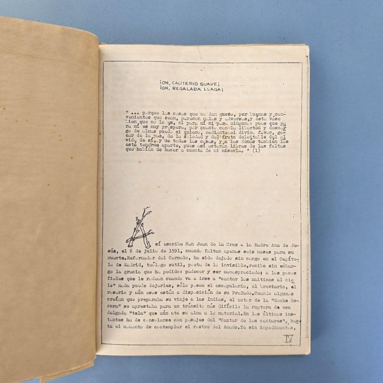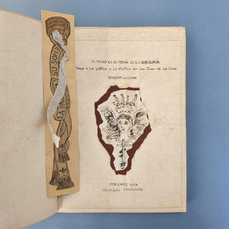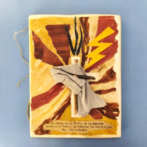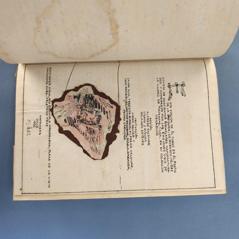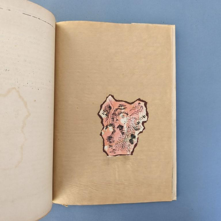Mimeographed text on white paper. The dust jacket is decorated with a beautiful collage of hand-coloured papers, featuring a cross made of sticks tied together with string, and a piece of fabric. Number 142 of 200 copies. 3 copies in WorldCat.