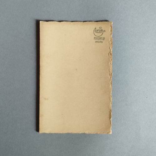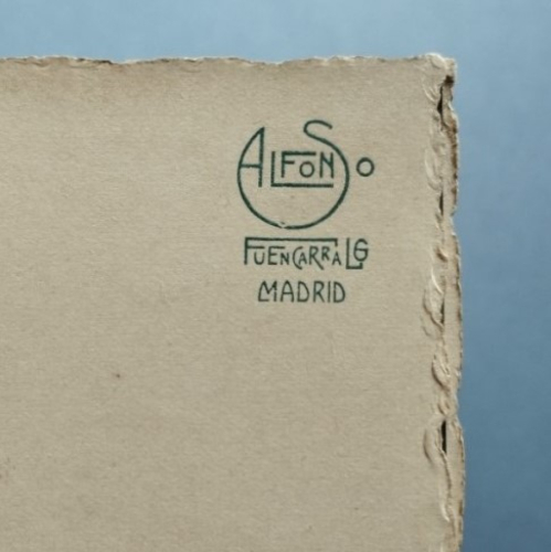 Fotografía de 9x14 montada en una pequeña carpeta de cartulina cortada por los bordes con un corte irregular - un bonito recurso modernista. Sellos atrás de Alfonso, Fuencarral 6.