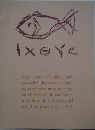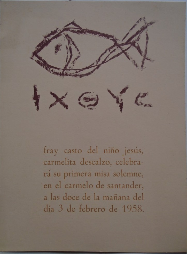 Texto, con dibujo de Maruri, impreso a dos tintas. El poeta santanderino Julio Maruri se ordenó como carmelita descalzo, con el nombre Fray Casto del Niño Jesús en 1958.