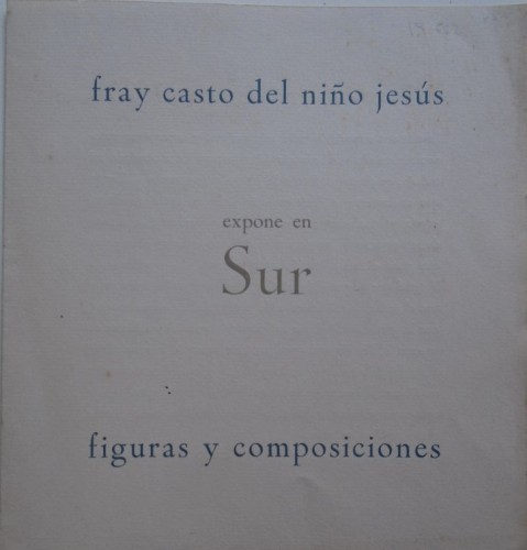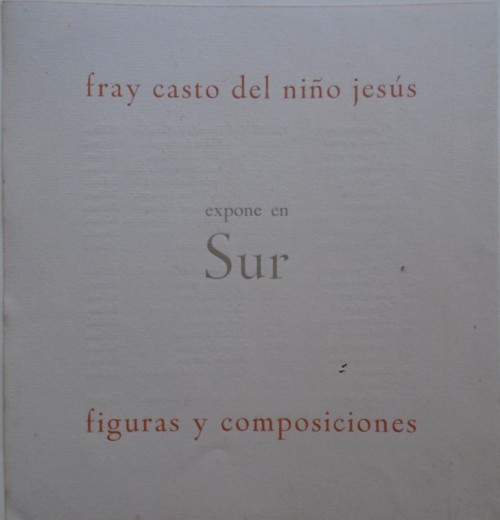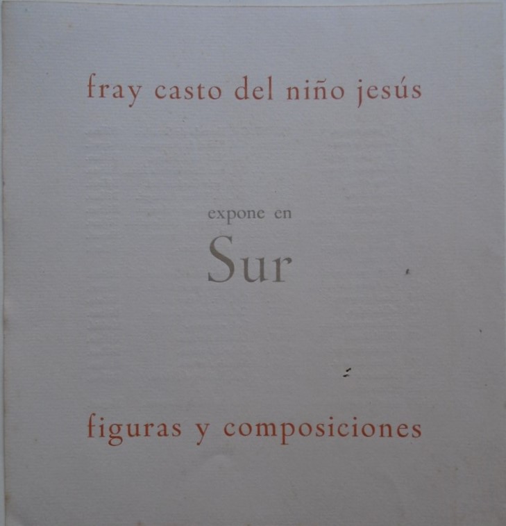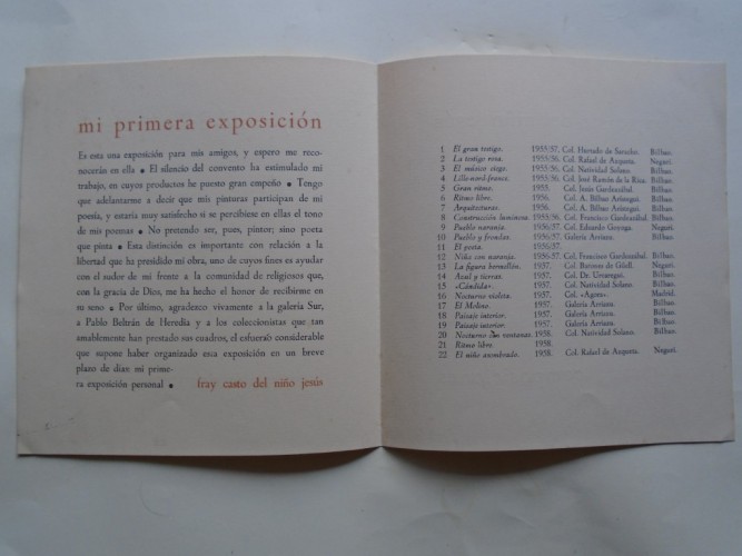 Texto de Maruri, (como Fray Casto) , con una lista de los cuadros expuestos. Impreso a cuatro tintas. El poeta santanderino Julio Maruri se ordenó como carmelita descalzo, con el nombre Fray Casto del Niño Jesús en 1958. Bello impreso de la casa Bedia.
