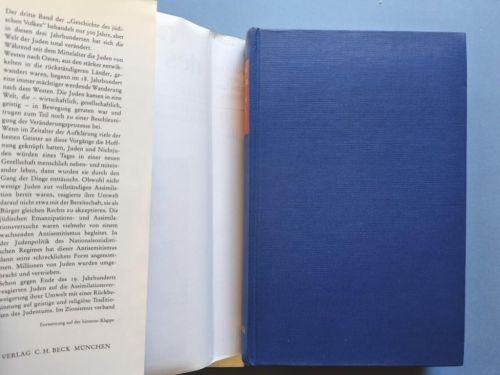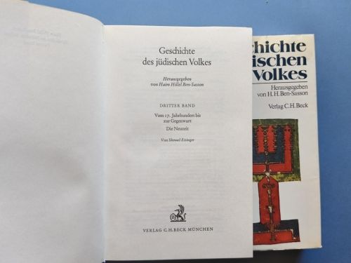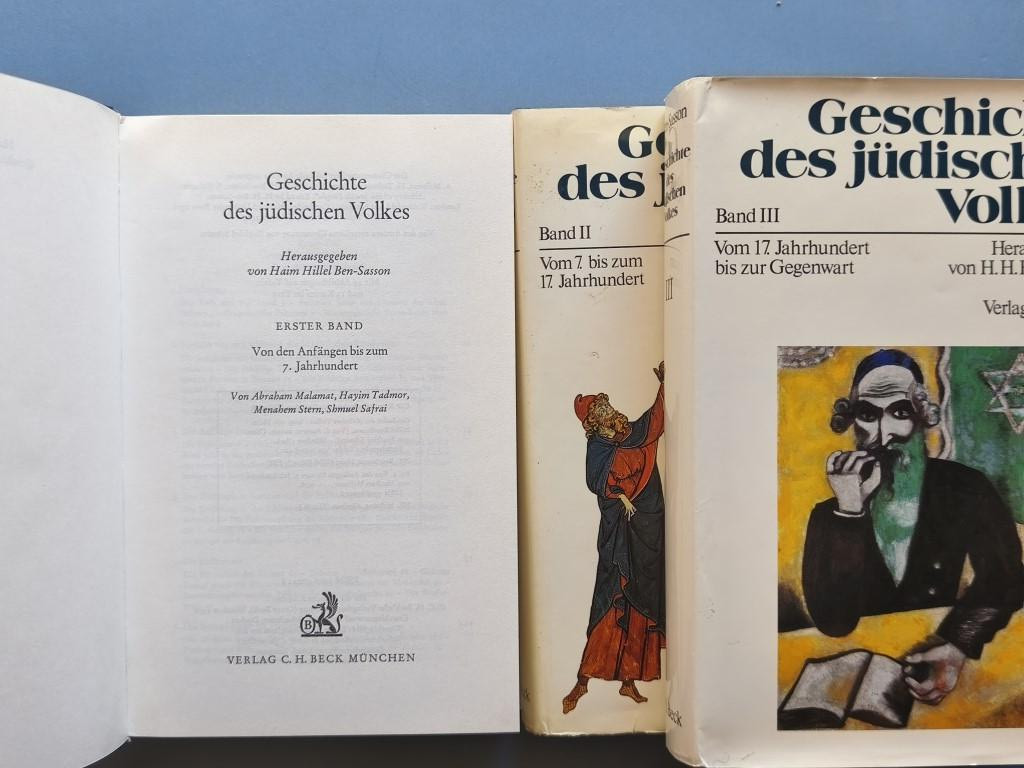 Geschichte des jüdischen Volkes. 1. Von den Anfängen bis zum 7. Jahrhundert. Von Abraham Malamat, Hayim Tadmor, Menahem Stern, Shmuel Safari / II. Vom 7.-17. Jahrhundert. Das Mittelalter / III. Vom 17. Jahrhundert bis zur Gegenwart. Die Neuzeit. 3 vol. , complete.