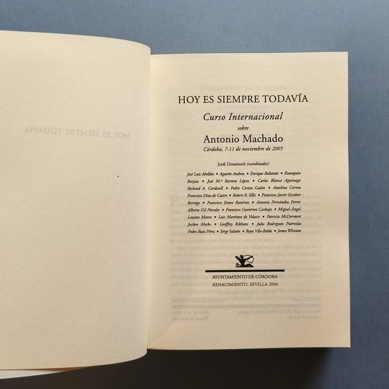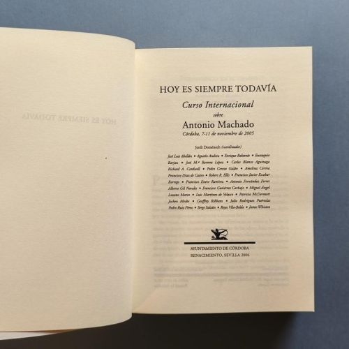 Hoy es Siempre Todavía. Curso Internacional sobre Antonio Machado (Córdoba, 7-11 de noviembre de 2005). Textos de José Luis Abellán, Eustaquio Barjau, José Mª Barrera, Carlos Blanco Aguinaga, Richard A. Cardwell, Pedro Cerezo, Amelina Correa, Antonio Fernández Ferrer, Geogffrey Ribbans, Julio Rodríguez Puértolas, Serge Salaün, etc.