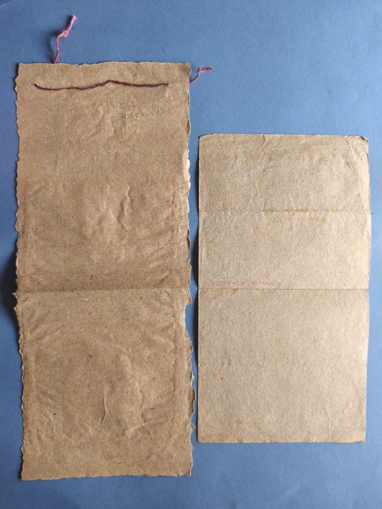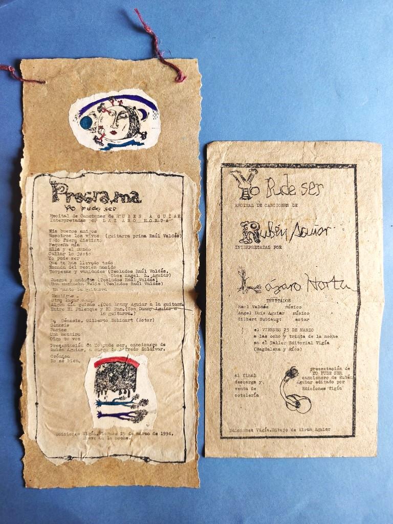 (a) Invitation and (b) programme. (a) A sheet of rough kraft paper with typewritten text, calligraphic titles reproduced by mimeograph, featuring a drawing by Hiram Aguiar, with a name written in red ballpoint pen on the reverse; (b) "Pergamino" on a sheet of brown paper torn at the edges; text typed and mimeographed on beige paper and mounted; drawings by Hiram Aguiar on white paper, torn out, coloured and mounted. No print run details provided. Three copies of the book of the same title are listed in WorldCat, but none of the programme or the invitation. These ephemera occupy a central place in Vigía’s publishing output and are extremely rare.