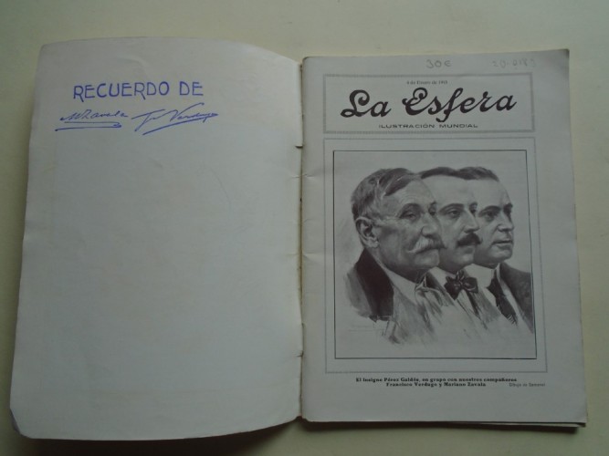 Número extraordinario y en miniatura (el tamaño es la cuarta parte de un número normal) de La Esfera, Ilustración Mundial producido por los redactores y colaboradores de la revista en homenaje a los directores Francisco Verdugo y Mariano Zavala después del primer año de publicación. La idea< del homenaje originó de Benito Pérez Galdós (se reproduce una carta y dos retratos), y se incluyen textos de Jacinto Benavente, Emilia Pardo Bazán, Carmen de Burgos, José Francés, Martínez Sierra, etc., con ilustraciones de Cerezo Vallejo, Varela de Seijas, Bartolozzi, Moya del Pino,
