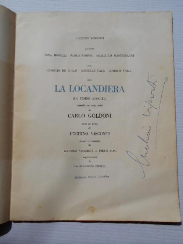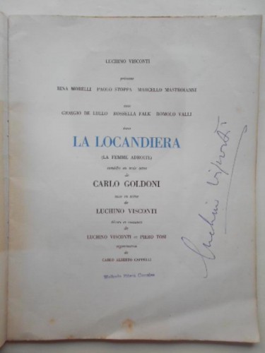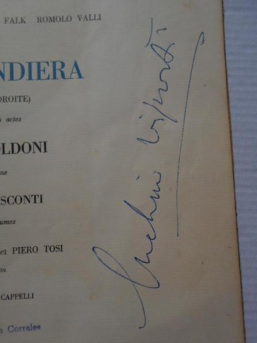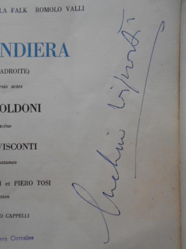 Spine and margins of the covers have been reinforced; some light foxing in the interior. Stamp of the Cuban cinema critic Wafredo Piñera on the title page. Signed Luchino Visconti on the title page. This Visconti production was first put on in Italy in 1952 with the Rina Morelli-Paolo Stoppa Company, with Marcelo Mastroianni as Ripafratta, and subsequently went on tour in Italy. The production was revived for the Festival International d'Art Dramatique in Paris in 1956. Our beautifully (and luxuriously) produced programme dates from this later revival.