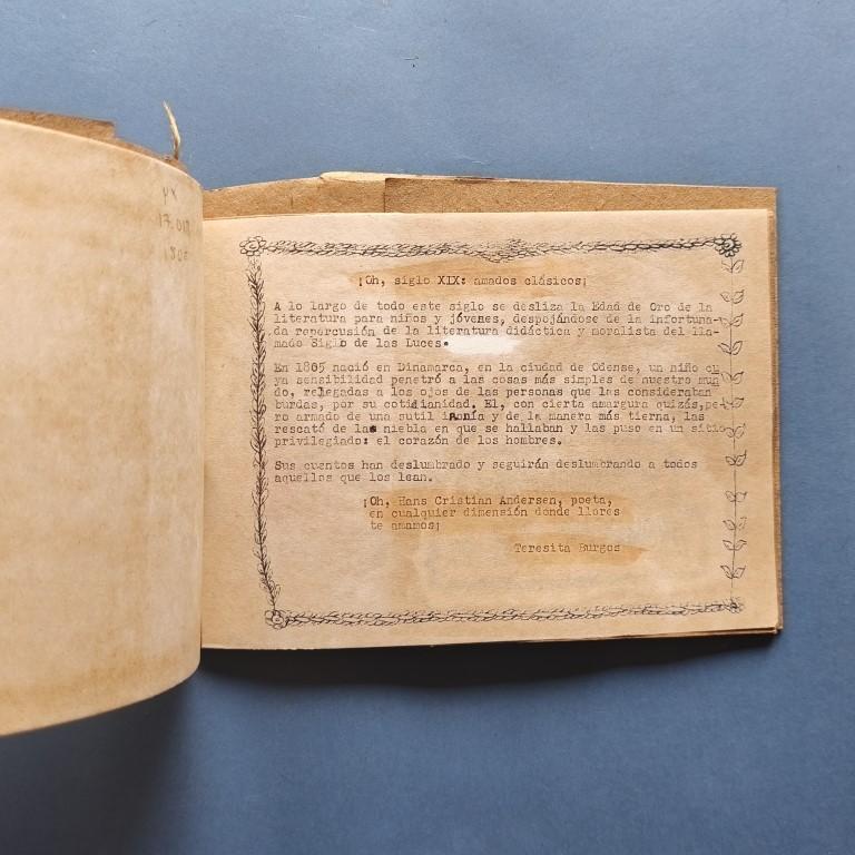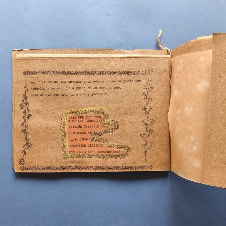 Paperback, stapled and bound with a rough yucca string. Titles torn out and pasted in. The text is typewritten, mimeographed and illuminated. Edited and with a foreword by Teresita Burgos. Number 46 of a print run of 100 copies. 7 copies in WorldCat. A very simple publication of the Periodo Especial.