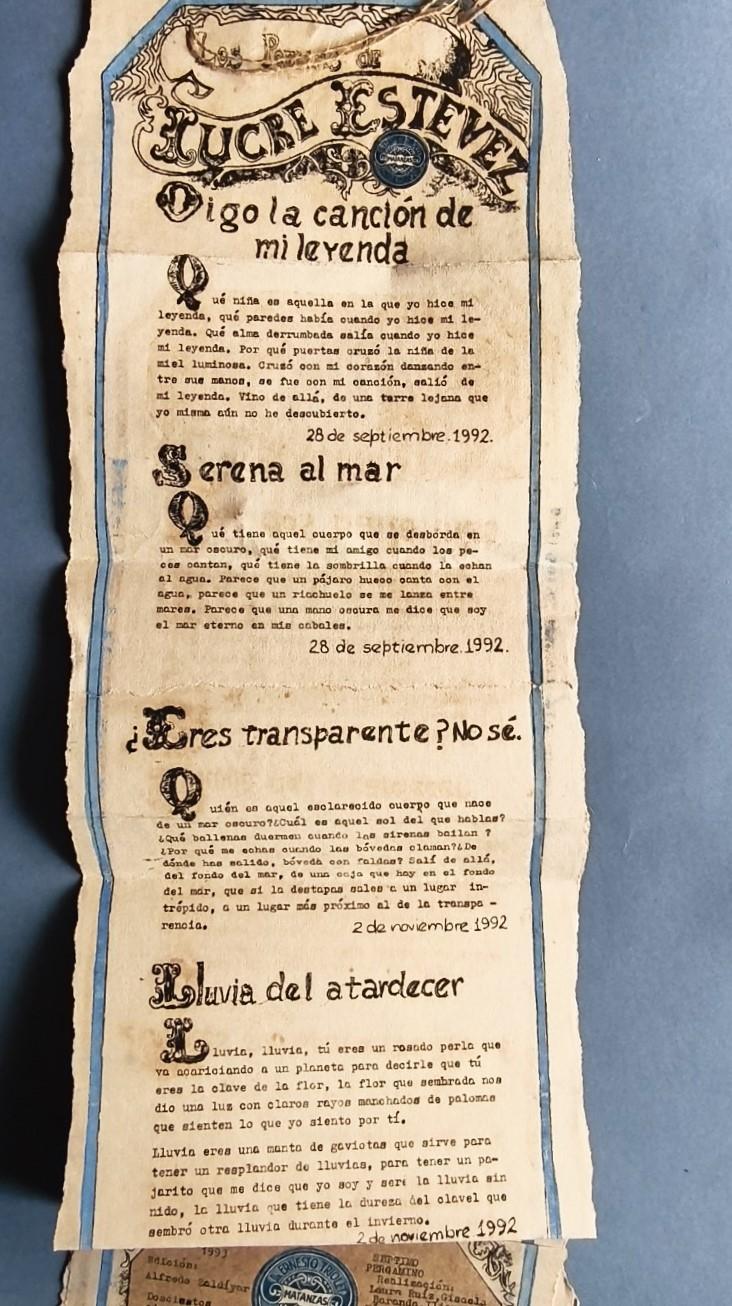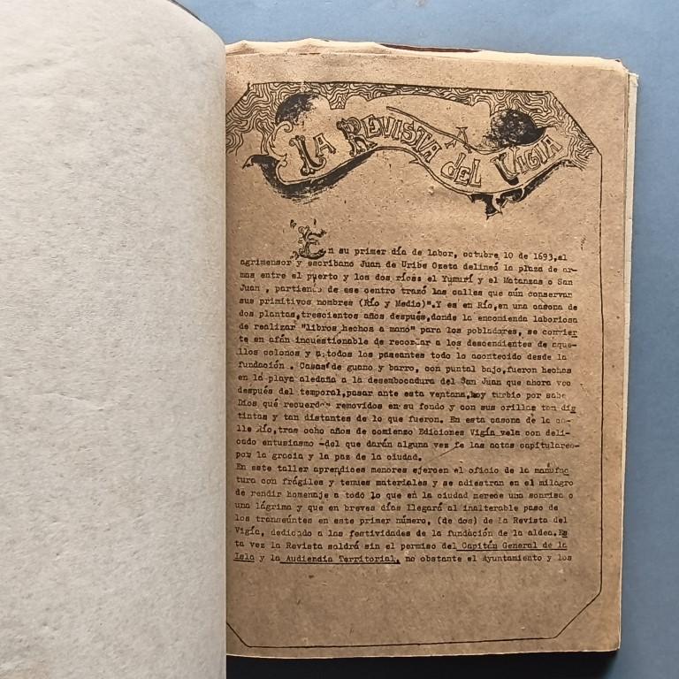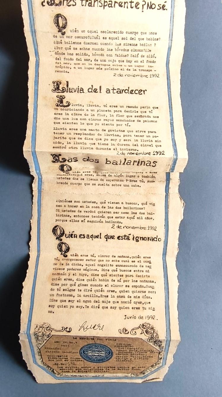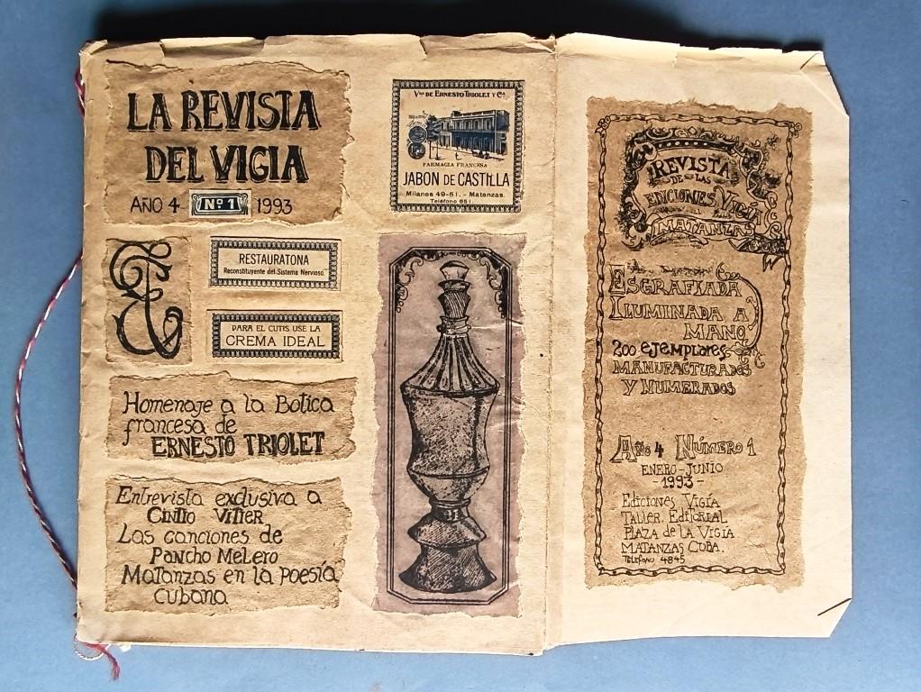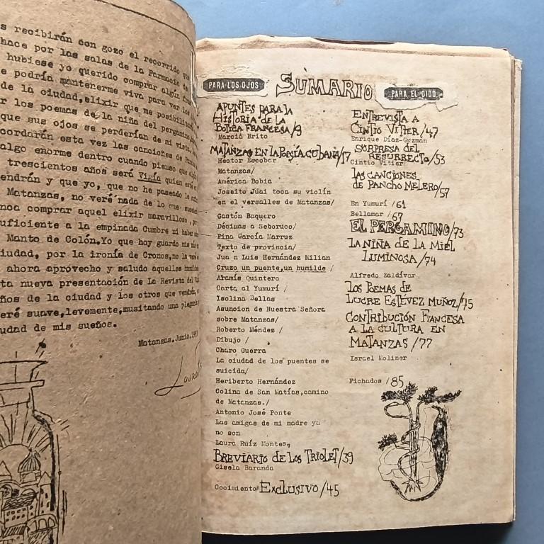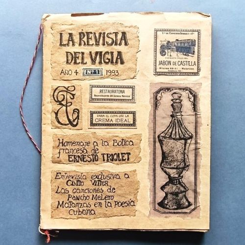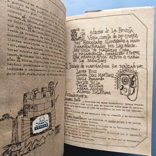 Stapled plain card wrappers; dustwrapper on crude white paper with torn out titles and illustrations, and vintage pharmacy labels. Mimeographed text on kraft and crude white paper (this last has foxed). 83 centimeetre folding "pergamino" by Lucre Estévez. Poetry by Fina García Marruz, Gastón Barquero, Aramis Quintero, Laura Ruiz Montes, poema and interview by Cintio Vitier, etc. Nº 132 of 200 copies. More photos on our website.