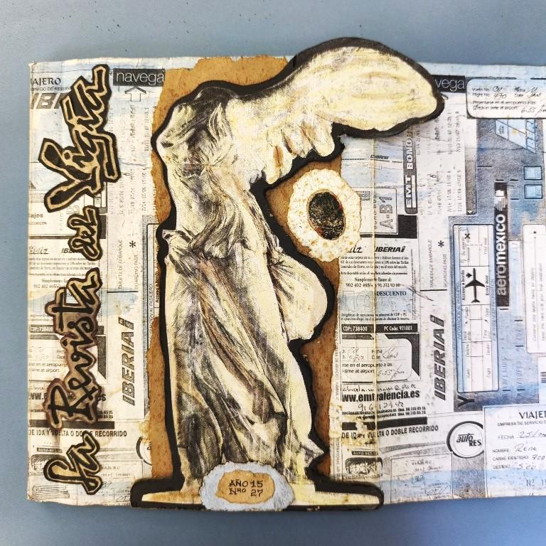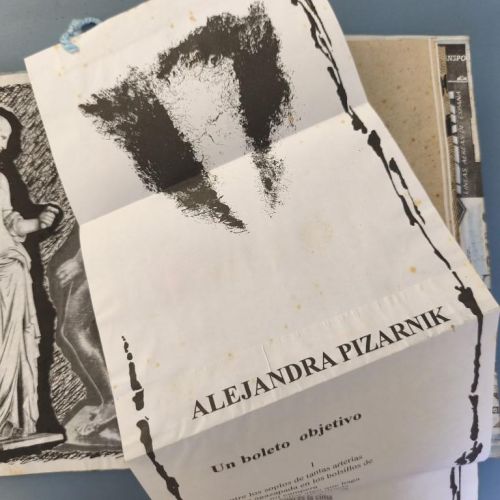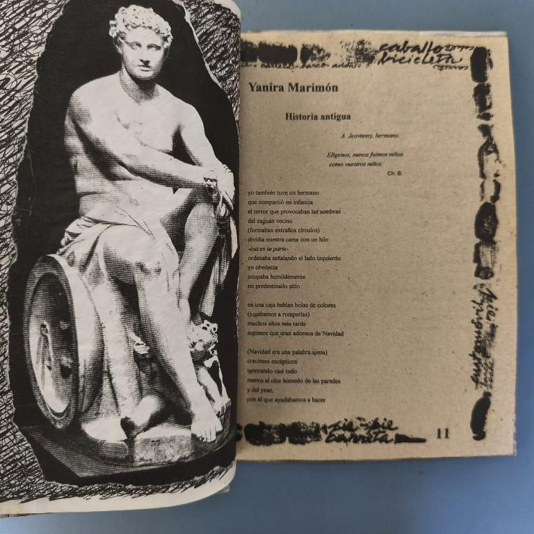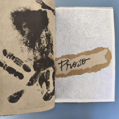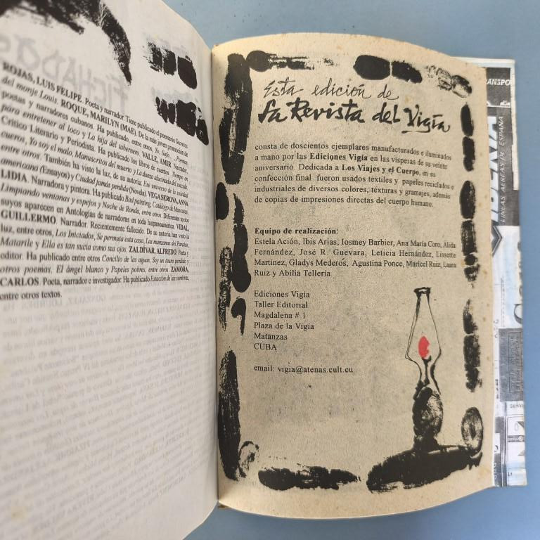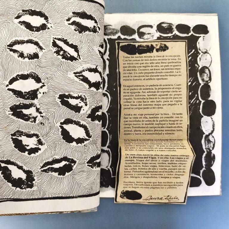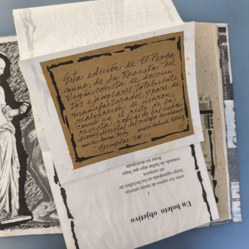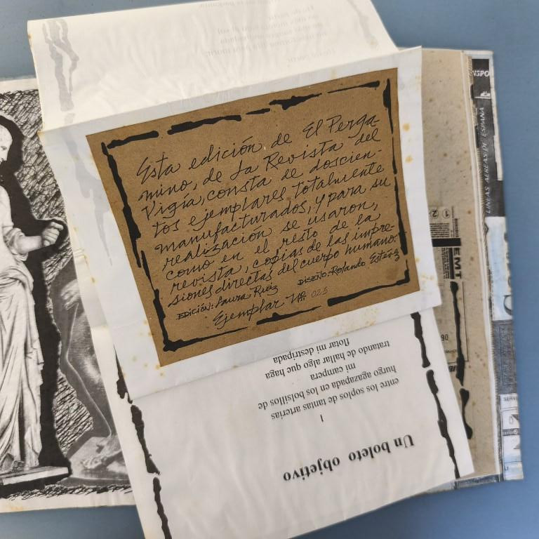 This issue does not appear to state the year of publication anywhere (although with Vigía it is really impossible to say for certain that something is not included, as each publication offers so many places in which to hide any text or information...); we have taken the year from the 'Bibliografía de las Ediciones Vigía'. This issue is dedicated to ‘Travel and the Body’ and is illustrated with ‘direct prints of the human body’. Judging by their appearance, they are prints made by photocopying parts of the body (a classic feature of office Christmas parties when things get out of hand) and some of them are images of great beauty featuring lips and fingers; there are also feet and faces and, of course, genitalia of both sexes are not missing. The cover is decorated with reproductions of train and plane tickets, etc., and features a headless angel mounted on hardboard and hand-illuminated. It includes texts by Digdora Alonso, Alfredo Zaldívar, Mabel R. Cuesta and Eugenio Montale; the scroll (20.5x100cm) is by the Argentine poet Alejandra Pizarnik. Some traces of foxing on the covers and interior. Number 23 of 200 copies.