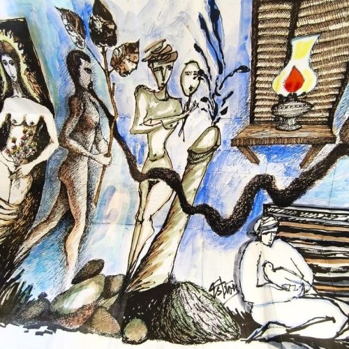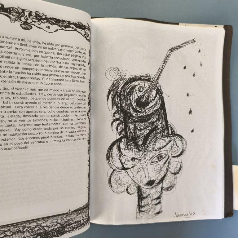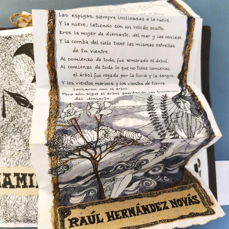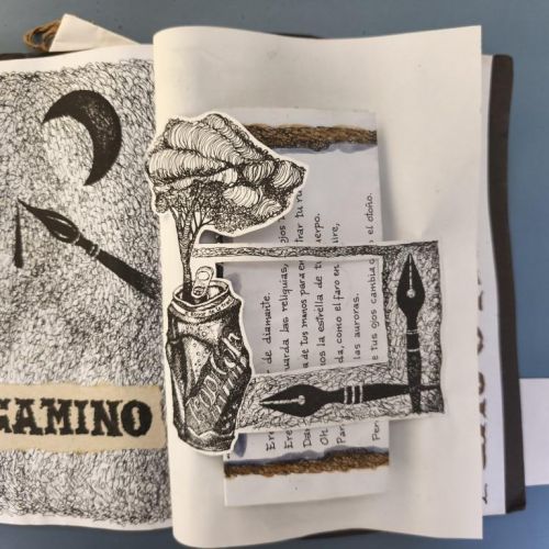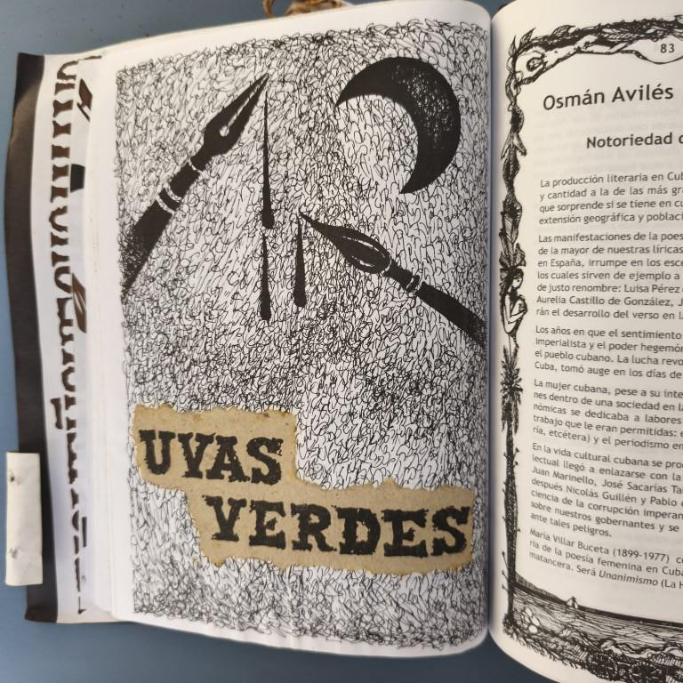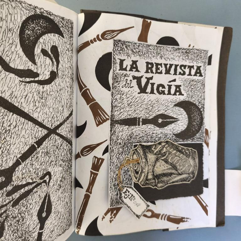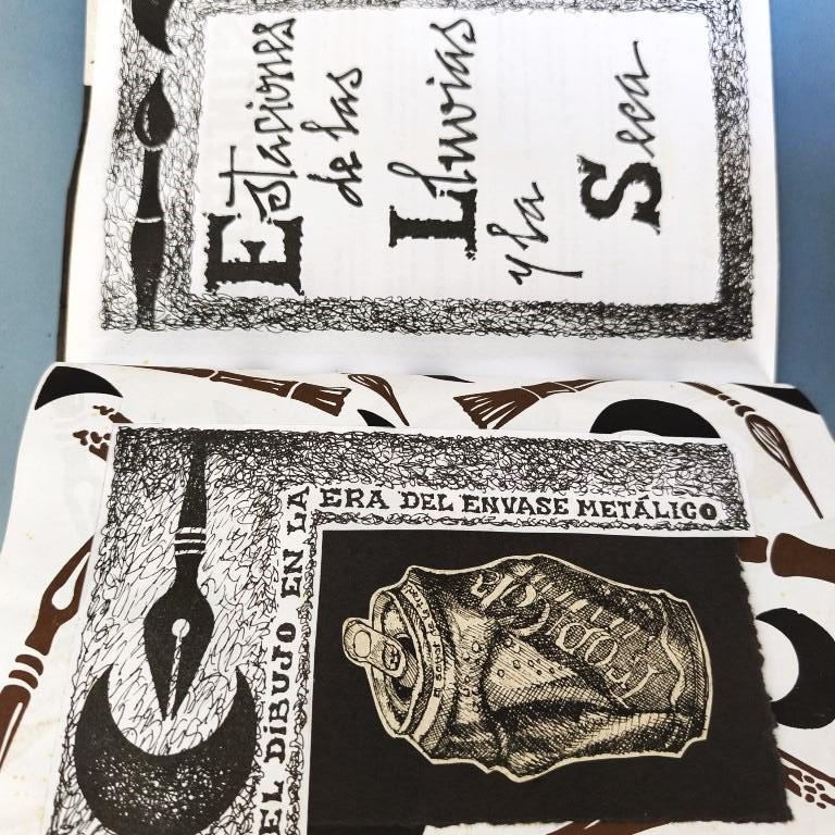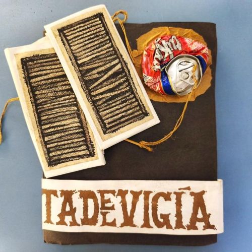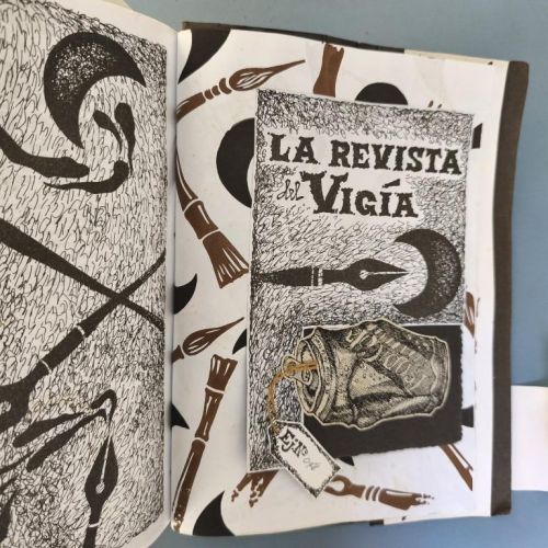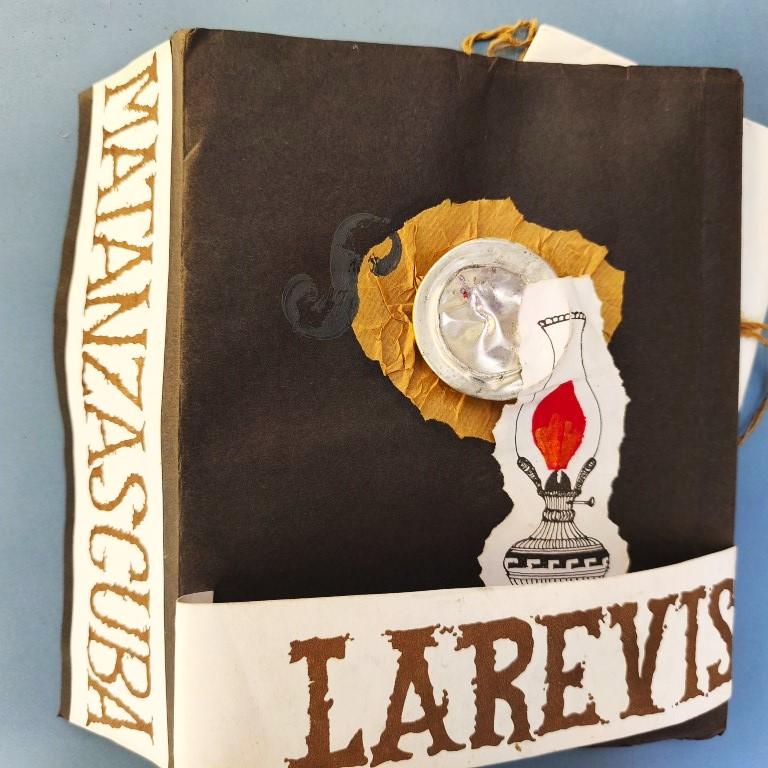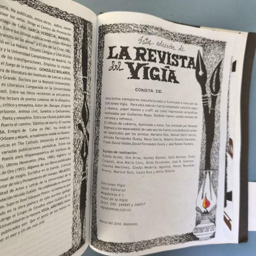 The window fixed to the cover unfolds to reveal an attractive handcoloured poster (70x50cm.) by Rolando Estévez, with two pieces of jute string to close it. Both covers decorated with crushed cans, torn papers, red cloth, watercoloured details. The risographed interior contains texts by Reynaldo García Blanco, Karel Bofill, Roberto Manzano, Ruth Behar, etc., with illustrations by e Marialva Ríos, Manuel Darío García, Frank David Valdés, etc., picking up the theme of the crushed can. At the end, tucked in place behind a decorative paper strip, we find the 'pergamino' a separate concertinaed poem by Raul Hernández Novás, illustrated by Rolando Estévez, and coloured by hand. The annual magazine showcases the best virtuoso graphic design of the Vigía team, and this number is a truly spectacular example. Design and lettering by Rolando Estévez. Number 48 of 200 copies.