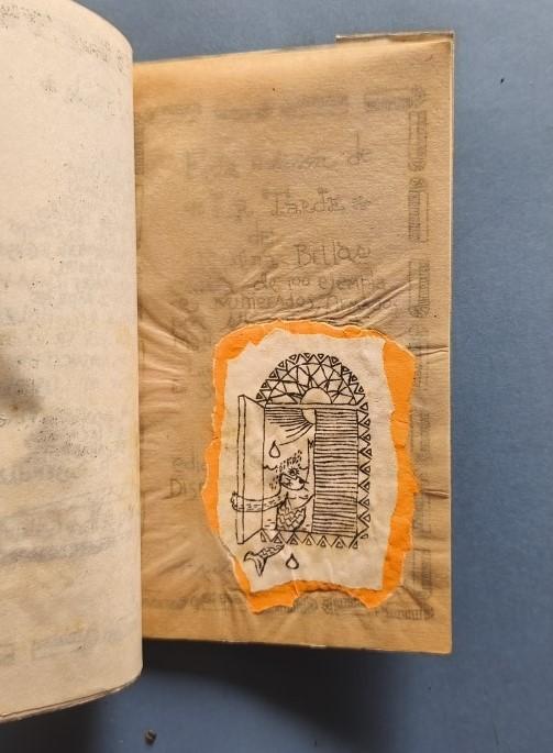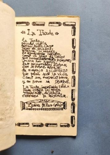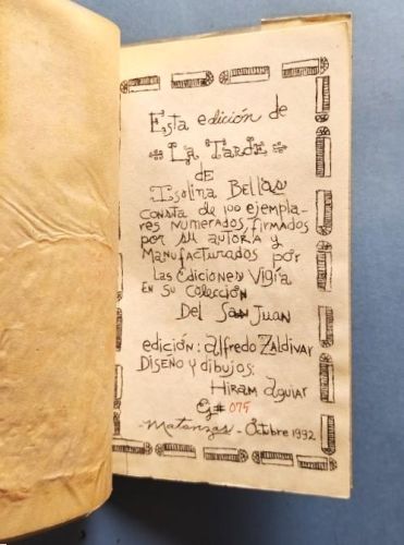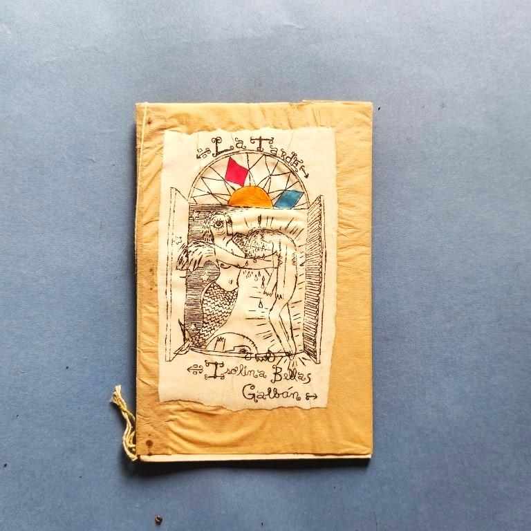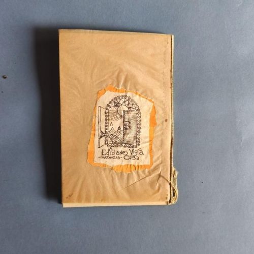 Wrappers, stapled, with a dust jacket; the dust jacket tied with a string. The text is hand-written and mimeographed on white paper. The dust jackets are made of tracing paper, decorated with drawings and titles on torn out pieces of paper that have been mounted and retouched with watercolour; inside, there are two drawings on white paper, torn out and mounted on tracing paper. Number 75 of a print run of 100 copies. 4 copies in WorldCat. During the ‘special period’, Vigía published quite a few books of very few pages, with a print run reduced to half the normal amount. More photos on our website.