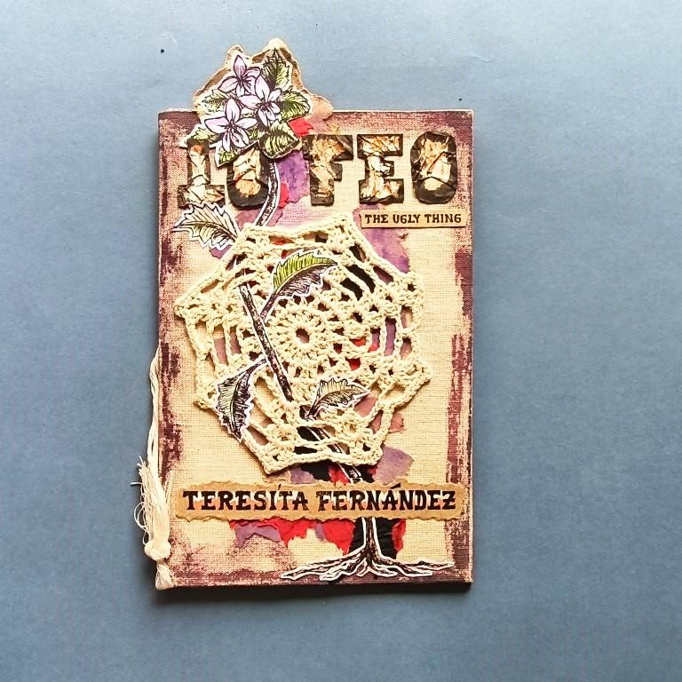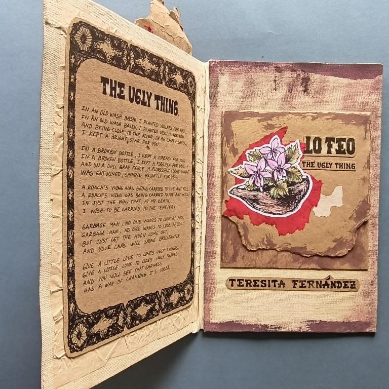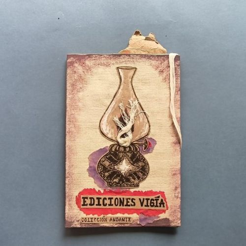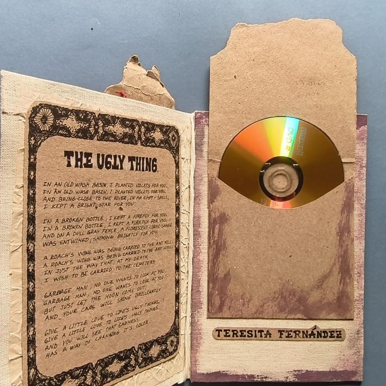 The cloth covered boards have been daubed with watercolour, decorated with hand cut, scrumpled and torn lettering, a collage of illustrations, a crotcheted doily (!), etc. The text is mimeographed on unbleached paper, with a CD in a decorative slipcase with a recital by the author. Design and illustrations by Maríalva Ríos. Number 53 of 200 copies.