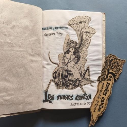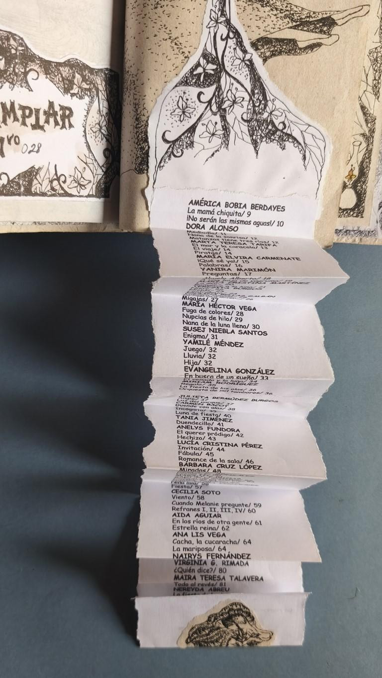 Wrappers, stapled. The cardboard covers are covered with crinkled paper coloured with watercolours; mounted on top are the titles and illustrations, cut out and illuminated, with the front cover featuring ‘a majagua leaf collected by the children David and Alejandro’. The text is printed on white and brown paper, with a border and full-page illustrations. Includes a handmade bookmark. The index is on a 60cm ‘parchment’. The anthology includes poems by 43 Cuban women poets, with 15 autographed dedications by Marta Teresa Tarifa, María Cristina Martínez, María Héctor Vega, Susej Niebla Santos, Yamilé Méndez, Tania Jiménez, Lucía Cristina Pérez, Bárbara Cruz López, Magaly Fariñas, Cecilia Soto, Yoleidys Hernández Jiménez, Norma Martínez, Loreley Rebull and Maylán Alvarez. Number 28 of 200 copies. More photos on our website.