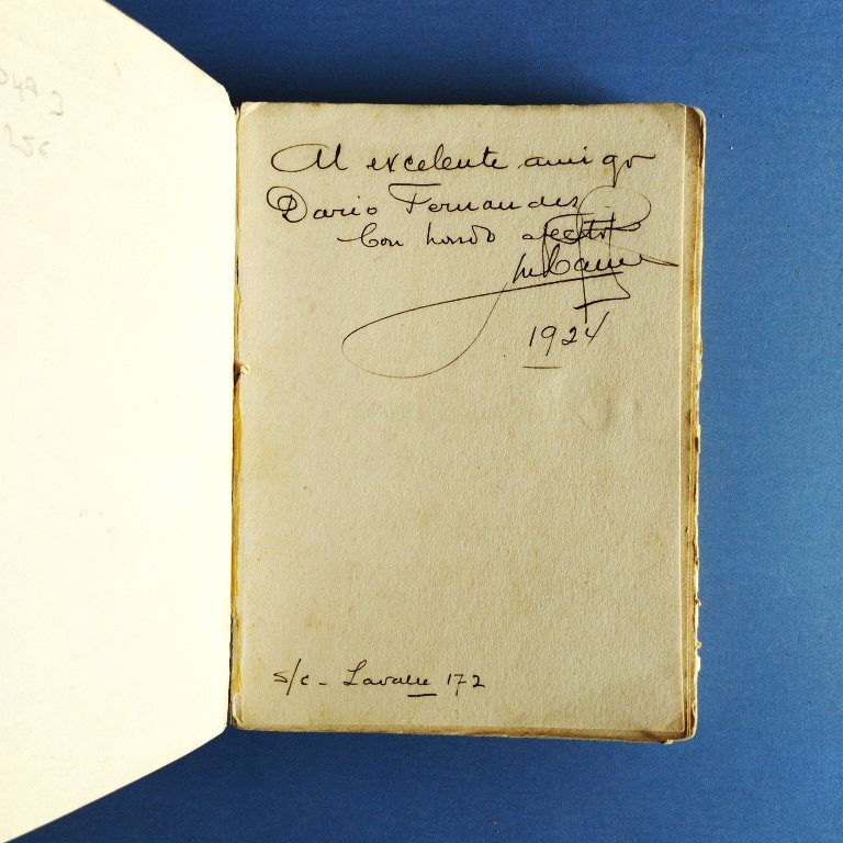 Dedicatoria autógrafa "al Excelente amigo Darío Fernández, con hondo afecto...". Lomo amarronado, con una vieja reparación. Falta en la esquina de la cubierta posterior y la última hoja, algunas marcas de lectura a lápiz. Bella ilustración y ornamentación de la cubierta y ex-libris de influencias precolombinas de Daniel Agrelo. (Más fotos en nuestra web).
