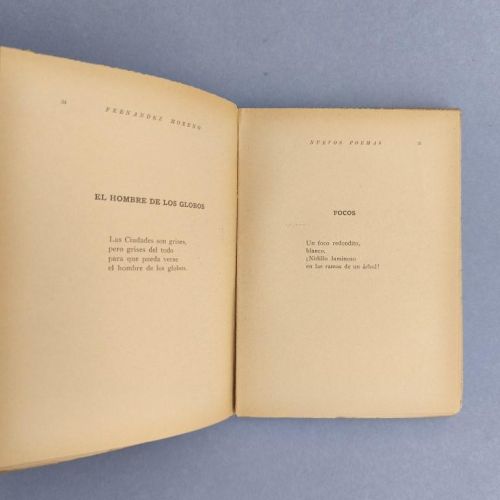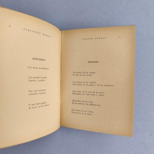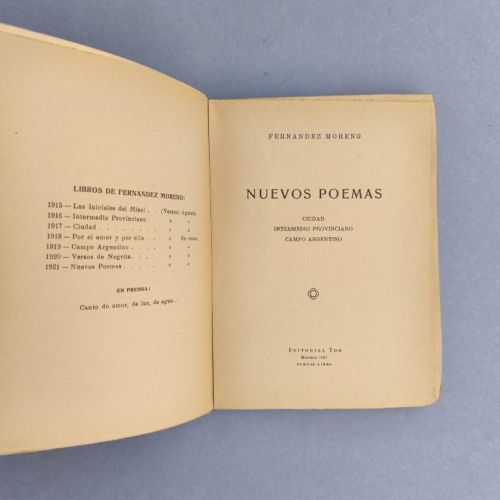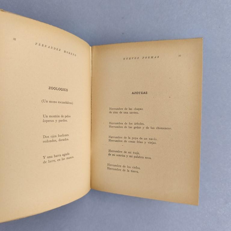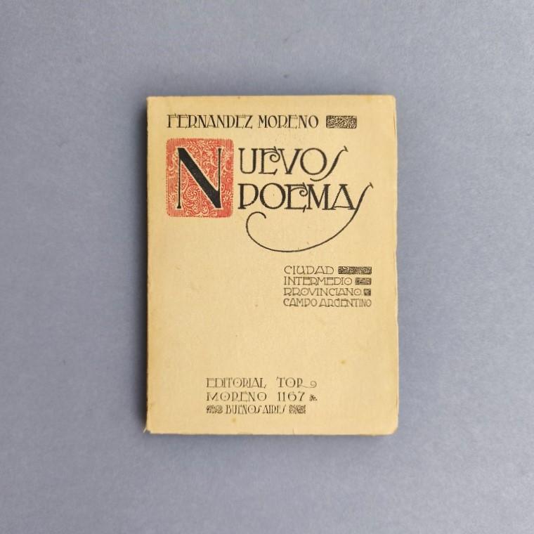 Muy buen ejemplar. "Nuevos Poemas es el más reciente volumen de versos de Fernández Moreno. Las tres partes de que se compone, llámanse: Ciudad, Intermedio Provinciano y Campo Argentino. Es que cada una de ellas es la continuación de los libros suyos así titulados. Los que hayan gustado aquellos poemas, deberán de notar en los nuevos una mayor agudeza y un perfeccionamiento más fino. En un vaso mejor elaborado, contiénese una ingenuidad más sutil. Hay poesías en el moderno volumen que, al ser conocidas, merecieron alabanzas vivas y entusiastas. (Noticia editorial, en la última página). Este tomo, a pesar de su título anodino, contiene muchos de los mejores poemas de este primer (y mejor) Fernández Moreno.
