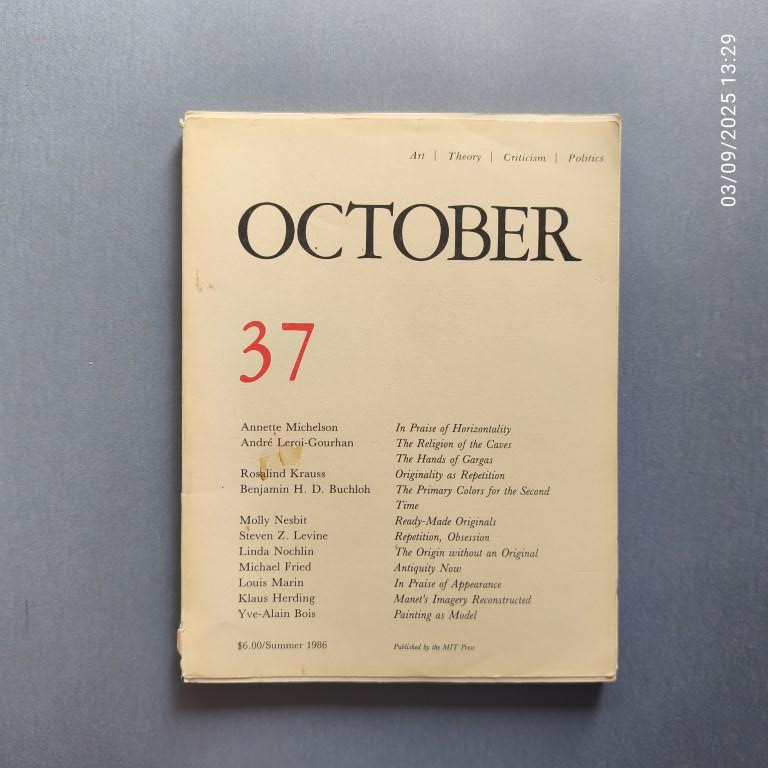 In Praise of Horizontality, by Annette Michelson and André Leroi-Gourhan; The Religion of the Caves: Magic or Metaphysics? By Annette Michelson and Andre Leroi-Gourhan; The Hands of Gargas: Toward a General Study, by Andre Leroi-Gourhan and Annette Michelson; Originality as Repetition, by Rosalind Krauss; The Primary Colors for the Second Time: A Paradigm Repetition of the Neo-Avant-Garde, by Benjamin H. D. Buchloh; Ready-Made Originals: The Duchamp Model, by Molly Nesbit; Monet's Series: Repetition, Obsession, by Steven Z. Levine; Courbet's 'L'origine du monde': The Origin without an Original, by Linda Nochlin; Antiquity Now: Reading Winckelmann on Imitation, by Michael Fried; In Praise of Appearance, The Art of Describing: Dutch Art in the Seventeenth Century by Svetlana Alpers, Review by Louis Marin and Richard Miller; Manet's Imagery Reconstructed, The Painting of Modern Life: Paris in the Art of Manet and His Followers by T. J. Clark, Review by Klaus Herding and John William Gabriel; Painting as Model by Yves-Alain Bois.