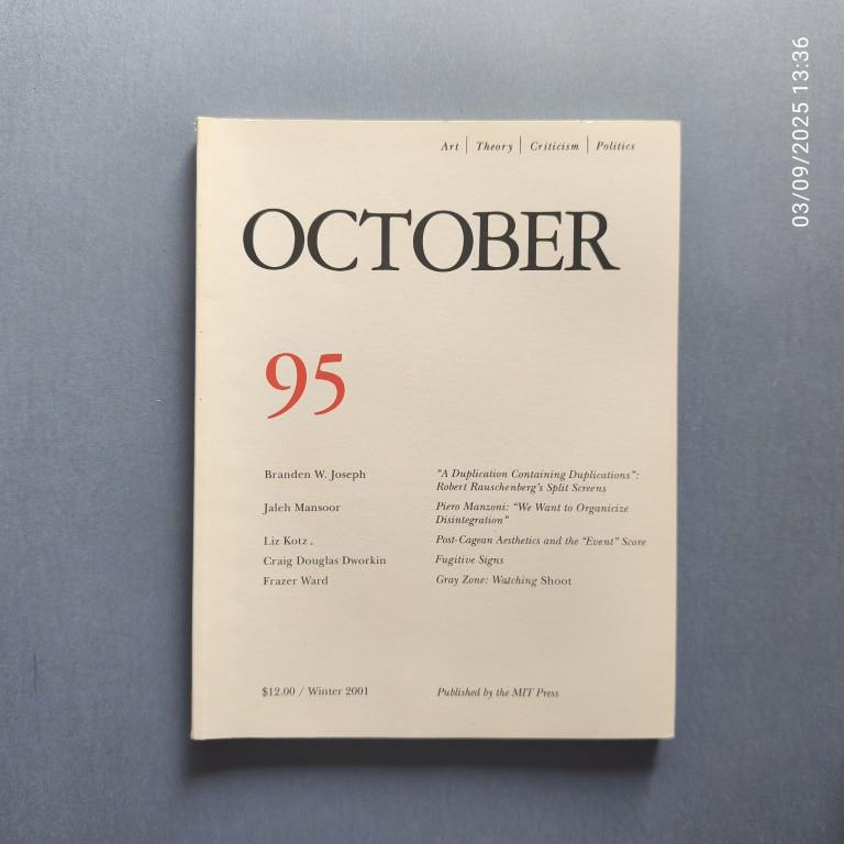 Good. 'A Duplication Containing Duplications': Robert Rauschenberg's Split Screens - Branden W. Joseph; 'We Want to Organicize Disintegration' - Jaleh Mansoor and Piero Manzoni; Post-Cagean Aesthetics and the 'Event' Score - Liz Kotz; Fugitive Signs - Craig Dworkin; Gray Zone: Watching Shoot - Frazer Ward.