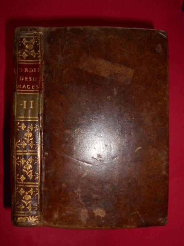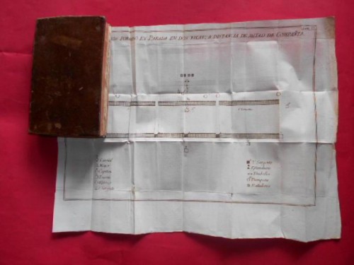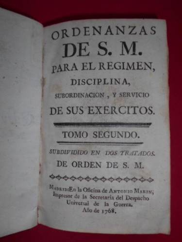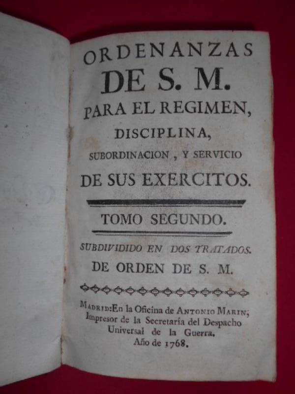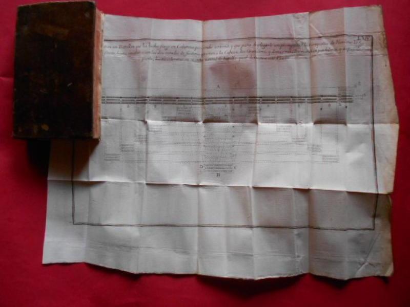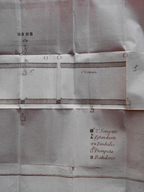 Volumen dos sólo (de dos). Palau 202892 (del segundo tomo dice: '4h., 151p. o 299? 15 láms. plegadas, págs. 153 a 244'). CCPBE registra un ejemplar en un volumen ('325pp, 4h. de grabs'), un ejemplar del tomo I, y un ejemplar del tomo II (pero un variante con '375pp, 6h. de grabs' y en 4º no 8º como la nuestra). Los dos tratados son: 1. Formación, manejo de arma, y evoluciones de infantería (con 18 capítulos); 2. De los exercicios de cavallería, y dragones, en que se explica sus formaciones, y maniobras (con 11 capítulos). Una lámina con pequeña falta, ligeras taladros de polilla en algunos margenes. Muy raro.