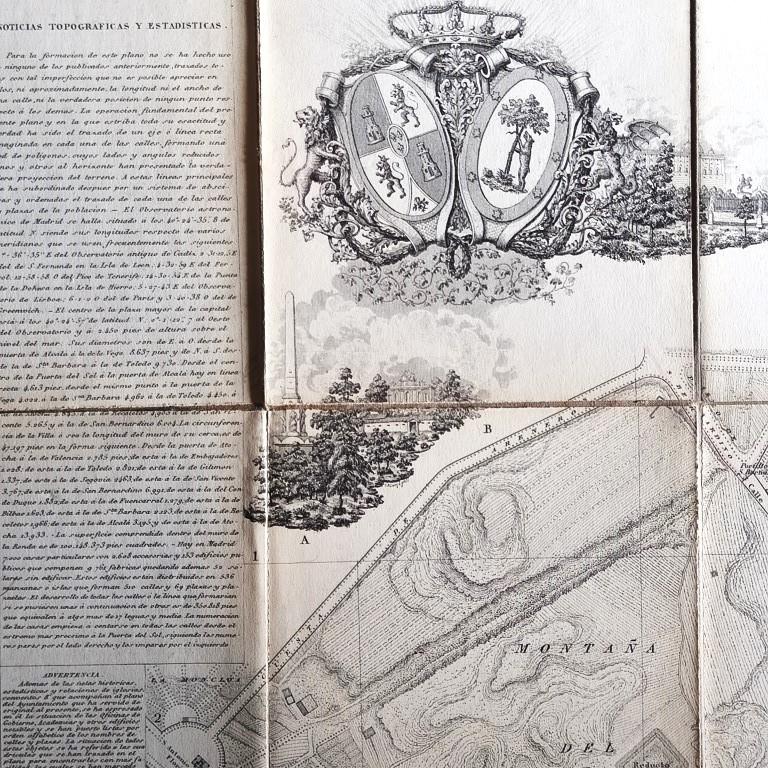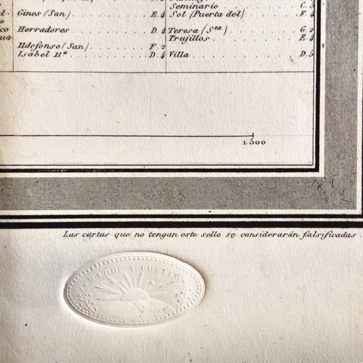 Mapa con notas explicativas, y las principales arterias coloreadas a acuarela; sello ('Madoz y Coello') de autenticidad en la esquina.. Muy buen ejemplar de este bello e histórico mapa.