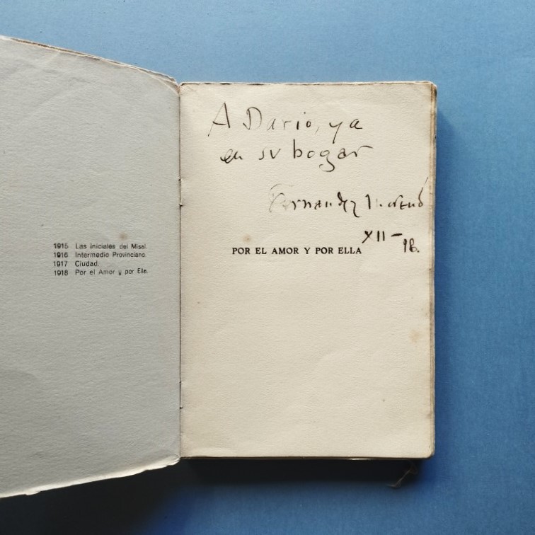 Dedicatoria autógrafa "A Darío [Fernández], ya en su hogar..." Reparaciones en el lomo (con una pequeña falta), pero buen ejemplar.