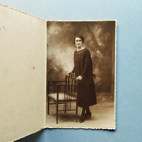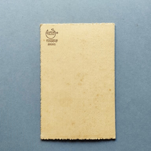 Fotografía original, impresión en sepia en gelatina de plata. Foto de 9x14, sobre una carpeta de cartulina estampada con el logo de Alfonso, con la dirección de Fuencarral 6. El retrato está tomada contra un fondo de decorado de estudio. Sin fechar, pero aprox. 1930.