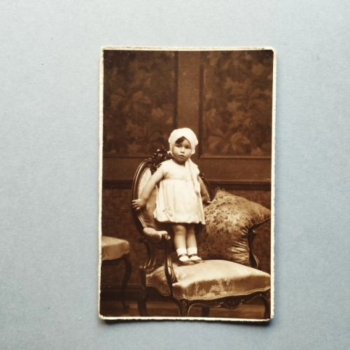 Fotografía original, impresión en sepia en gelatina de plata. Foto de 9x14.5, sobre una cartulina estampada con el logo de Alfonso, con la dirección de Toledo 63. El retrato está tomada contra un fondo de decorado de estudio. Sin fechar, pero aprox. 1920.