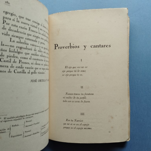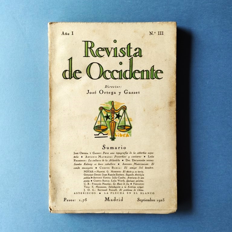 Antonio Machado (Proverbios y Cantares), Ortega, Corpus Barga, etc. Reseñas por Gerardo Diego, Antonio Espina, Ortega, etc. Cubierta y viñetas por Rafael Barradas. Con el índice del Tomo I. Pérdidas en el lomo, pero buen ejemplar.