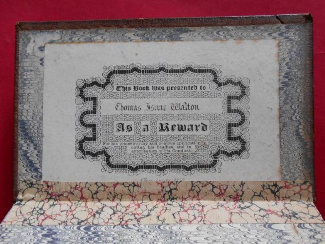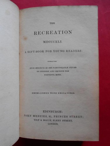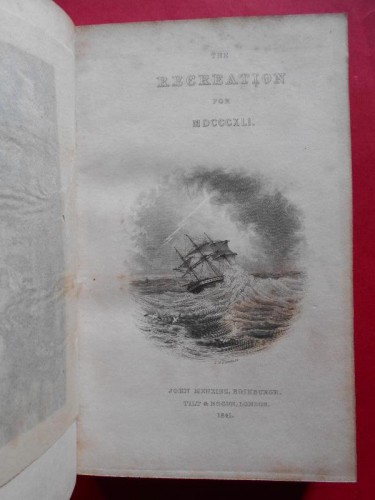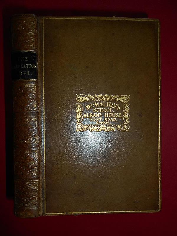 Published in 1840, late in the year, with the following year's date (1841), on the titlepage, this is the first of an annual series (to 1850). The texts are extracted from contemporary works, some anonymous but usually acknowledged, and divided into personal narratives and adventure, foreign travel, natural history and poetry. Included here are: Archer. Loss of the Phoenix in the West Indies, Riley. Sufferings in the Great Desert [Sahara], Wilde. Ascent to the Peak of Tenerife, Waterton. Capture of a cayman/Birds of South America, Cox. American wilderness, Ellis. Volcano in Hawaii, Audubon. Passenger pigeons of America, Beale. South-Sea whaling/Boat adventure near the Bonin Islands, Hoffman. Caverns of West Virginia. Although the engraved titlepage and the frontispiece are printed on the usual paper of the time for engravings, the five plates in the text are printed in Edinburgh on ART PAPER (coated on one side), and each has its original loose tissue guard; they have no plate mark. These are amongst the earliest examples of engraved plates printed on shiny surfaced kaolin-coated paper. One of these plates is badly darkened, but the others are still particularly fresh and white, with the image crisp, justifying the experiment. The Recreation series was a God-send for school Heads looking for awards for pupils; and this copy has a printed label pasted on the endpaper, '...for praiseworthy and zealous application...' dated 'Christmas 1840’ by hand, together with the recipient's name, Thomas Isaac Walton. It also bears the gilt stamp of the school on the front cover, 'Mr Walton's School, Albany House, Kent Road, Surrey'. This is one of the earliest school PRIZE BINDINGS that we have noticed. Spine rubbed with loss of gilding, old marble paper repair to one hinge, some foxing. Not in Osborne.