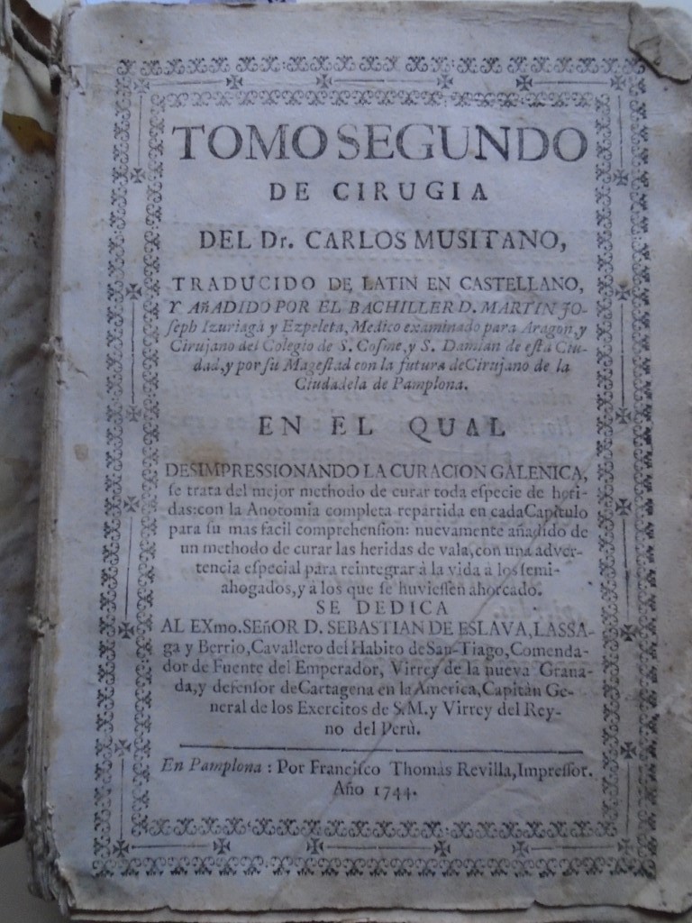 Carlo Musitano (Castrovillar, 1635 – Nápoles 1714) fue médico y sacerdote; además de esta obra, publicó estudios sobre las enfermedades venéreas y sobre las enfermedades de las mujeres. Esta obra salió en latín en Colonia Allobrogum (Ginebra) en 1698, con otra edición en Lyon el mismo año. De esta primera edición española WorldCat solamente recoge el ejemplar de la BNE, y un T. II suelto en la bilioteca de la Universidad de California en Los Angeles. El CCPB recoge otros 3 ejemplares, y REBIUN otro. Solamente la BNE y la Universidad de Navarra parecen poseer los cuatro tomos de la obra, y, con la excepción de la UN, ninguno menciona la lámina incluida en este ejemplar. Este es un libro, a pesar de su estado un tanto irregular, excepcionalmente raro.
