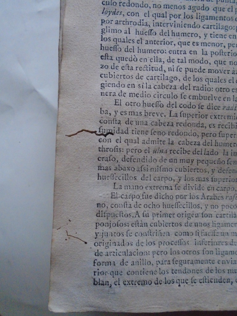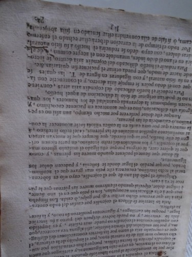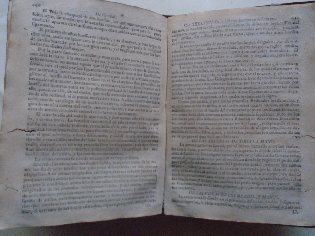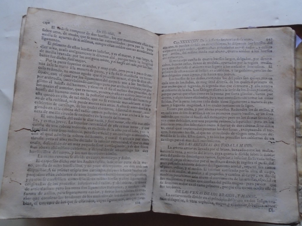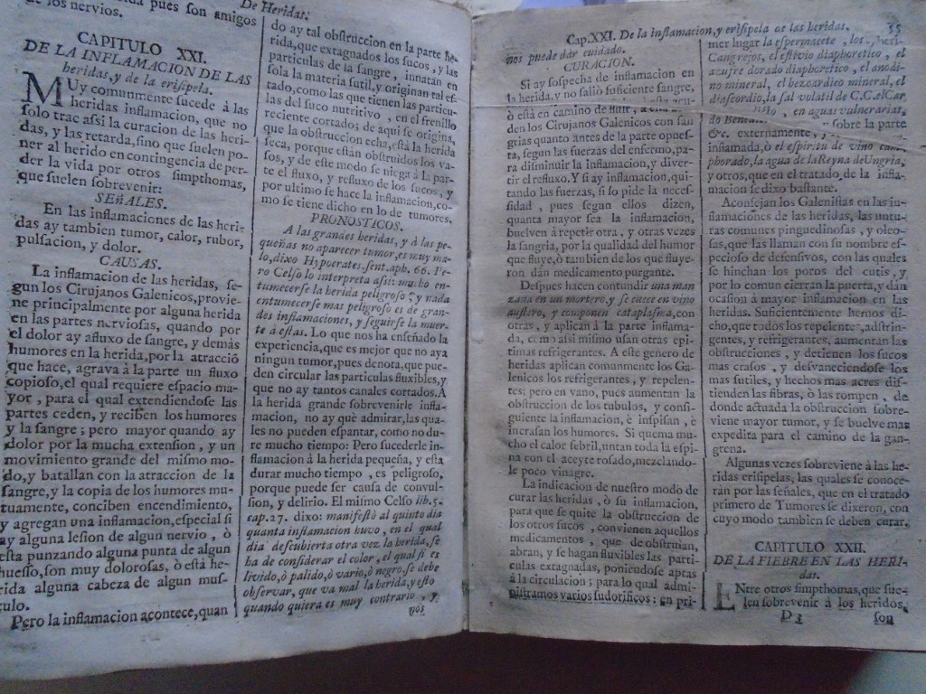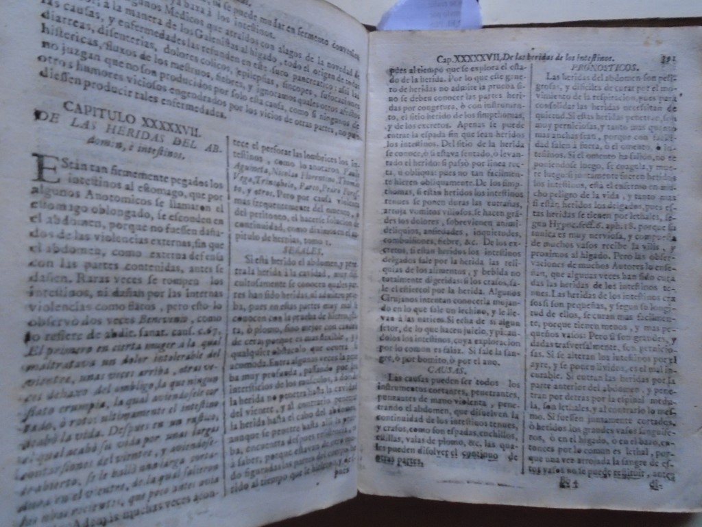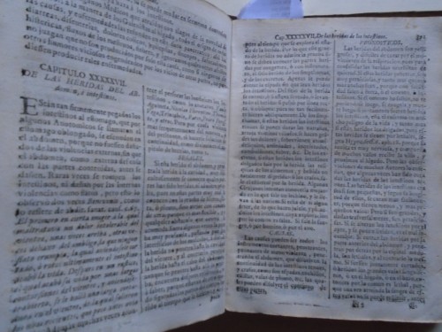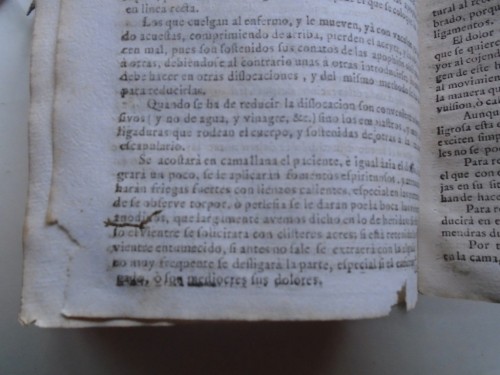 Encuadernación parcialmente suelta; portada algo manoseada por los márgenes. En algunas breves secciones hay pequeñas galerías de polilla marginal que también se adentra en el texto; son picaduras pequeñas, que apenas se notan (hemos incluido fotos de las hojas más afectadas). Los peores defectos del libro son de la edición en sí - una descuidada impresión, como si el impresor no supiera, o no se hubiera molestado en sacar unas hojas limpias, impresas con una adecuada entintado. Esta pobreza de impresión - en otros libros acompañado por una mala calidad de papel, que en este libro no está mal - es realmente común en los im presos españoles de gran parte del s. XVII y la primera parte del XVIII, reflejo fiel, del estado del país, su política y su monarquía.