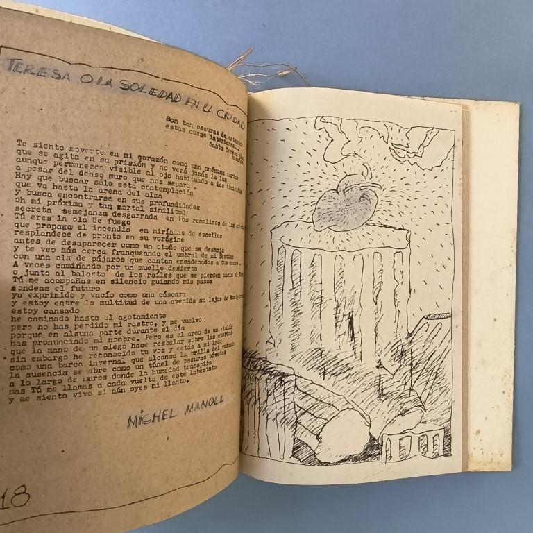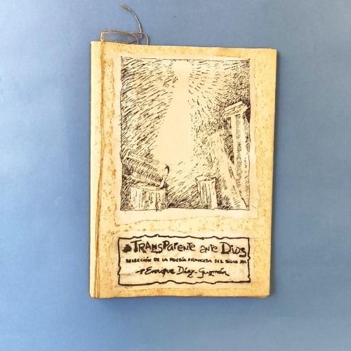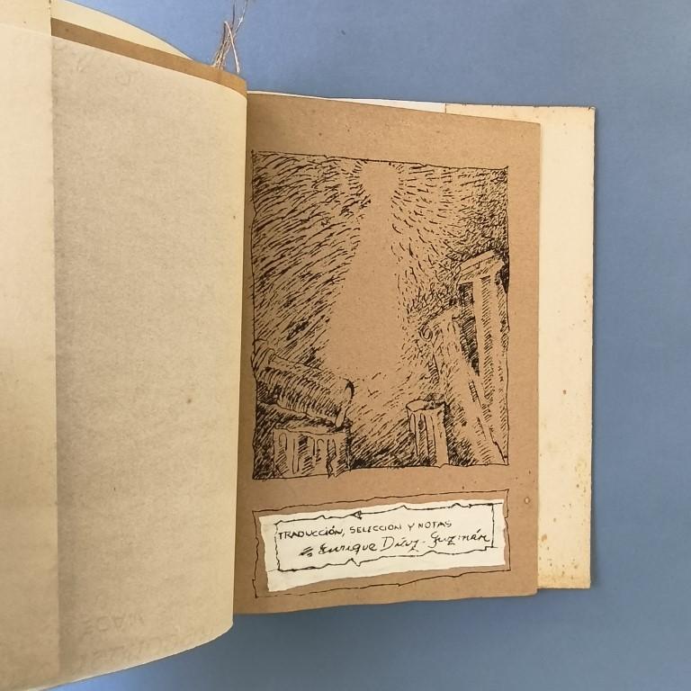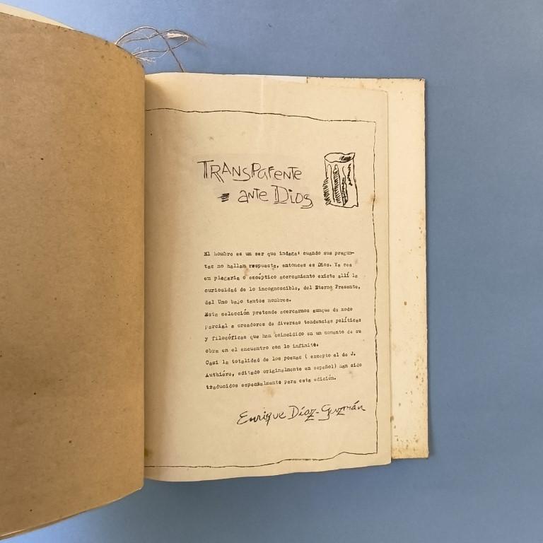 The dust jackets, of coarse cardstock, feature torn-out and mounted drawings and titles. The text, reproduced by mimeograph on a variety of brown paper and other low-quality papers, has titles (and parts of the illustrations) highlighted with white watercolour. The illustrations are by Yovani Bauta. Poems by Jacques Audibert, Lanzo de Vasto, Pierre Seghers, René Ménard, etc. Number 75 of a print run of 200 copies. Only 2 copies in WorldCat.